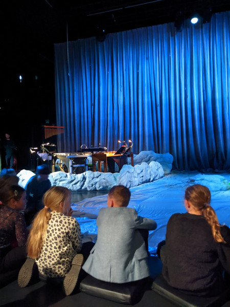 Beim anschließenden Probenbesuch in der Semperoper durften die Kinder einen ersten Ausschnitt des Stücks sehen. Noch nicht alle Geheimnisse wurden gelüftet, doch das Staunen und die Begeisterung waren bereits groß. Besonders beeindruckend war, dass die Kinder selbst Teil des Stücks sein durften: Gemeinsam ließen sie durch Bewegungen mit einem riesengroßen Seidentuch ein schäumendes, wogendes Meer entstehen. Ja sogar die Instrumente durften ausprobiert werden! Am Ende der Probe nahmen sich der Regisseur, die Bühnenbildnerin, Musikerin und Schauspielerin Zeit für Fragen der Kinder.