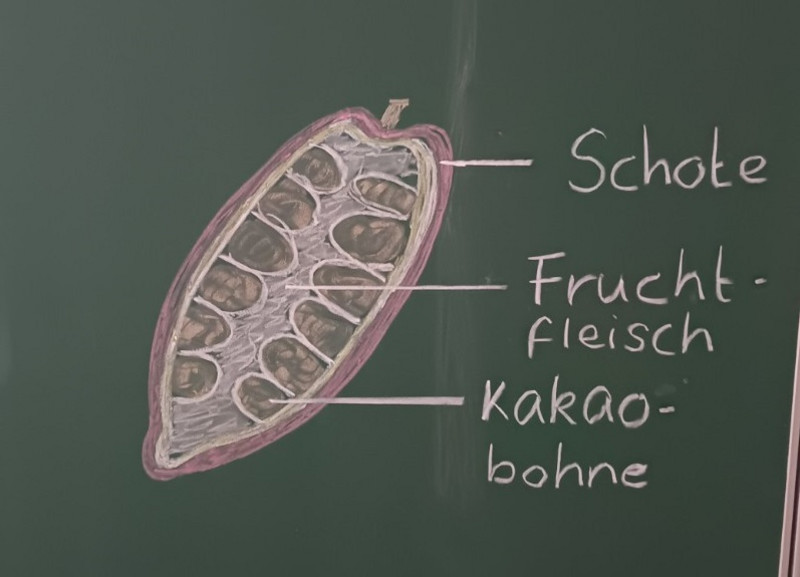Außerdem erkundeten wir den Kakaobaum und seine Früchte und erfuhren, wie aus den Kakaobohnen schließlich Schokolade entsteht. Besonders viel Freude bereitete es den Kindern, selbst aktiv zu werden. Es wurde Schokolade hergestellt, Kuchen gebacken und sogar Kakao so zubereitet und probiert, wie es schon die Maya getan haben.