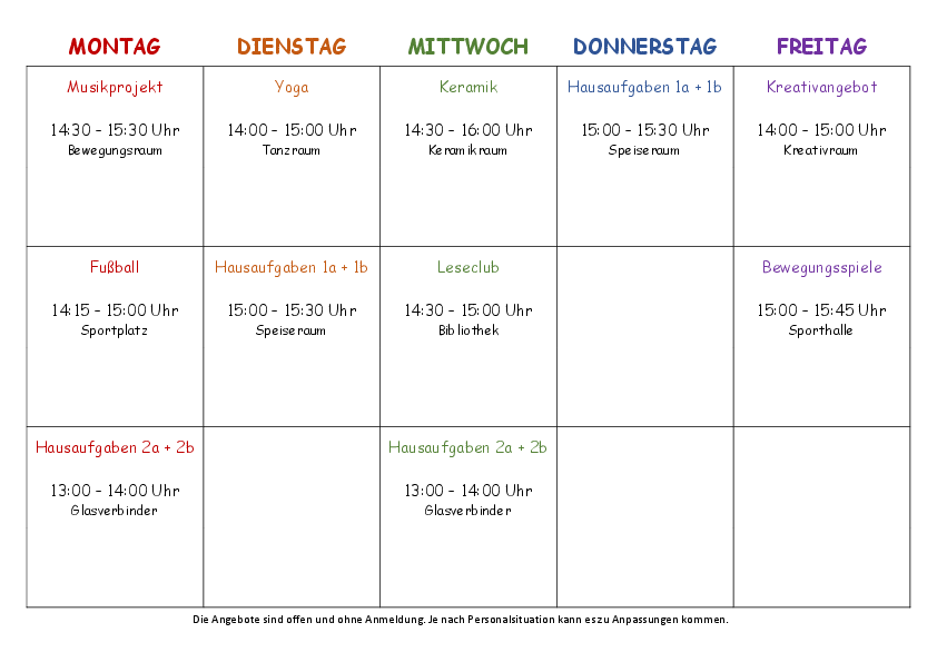 Wir möchten den Mädchen und Jungen vielfältige Angebote machen, bei denen sie ihren Interessen folgen und neue Fertigkeiten erlernen können. Soweit nicht anders festgelegt, sind regelmäßigen Angebote offen. Das heißt, die Kinder können ohne besondere Anmeldung teilnehmen. Im Schuljahr 2023/ 2024 finden folgende Angebote statt: