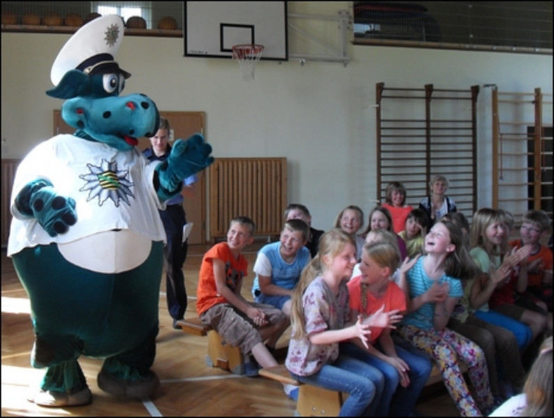 Zum Schluss begrüßte uns in der Turnhalle Poldi! Er hat mit uns ein spannendes Quiz gespielt.