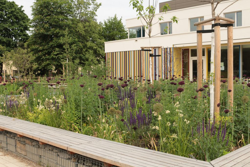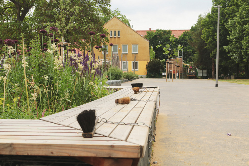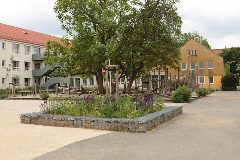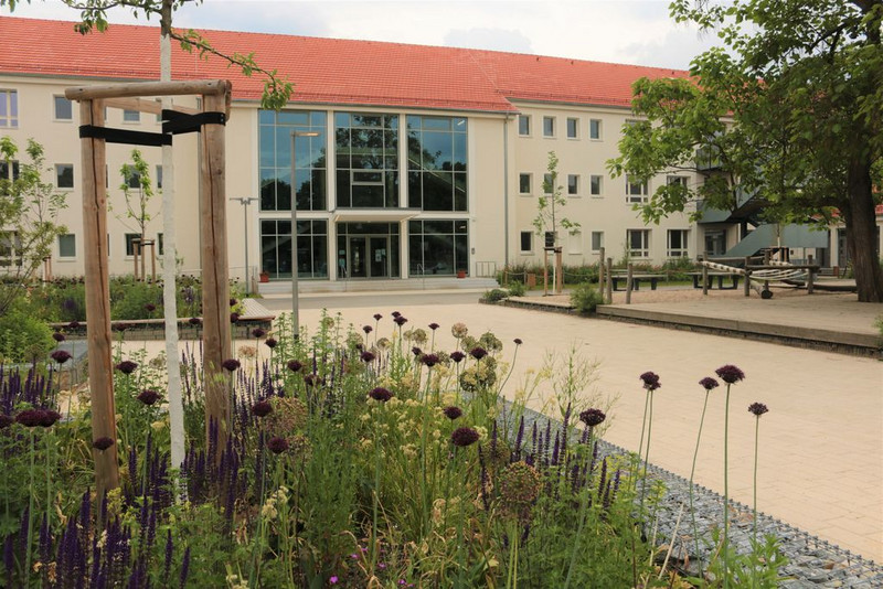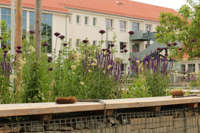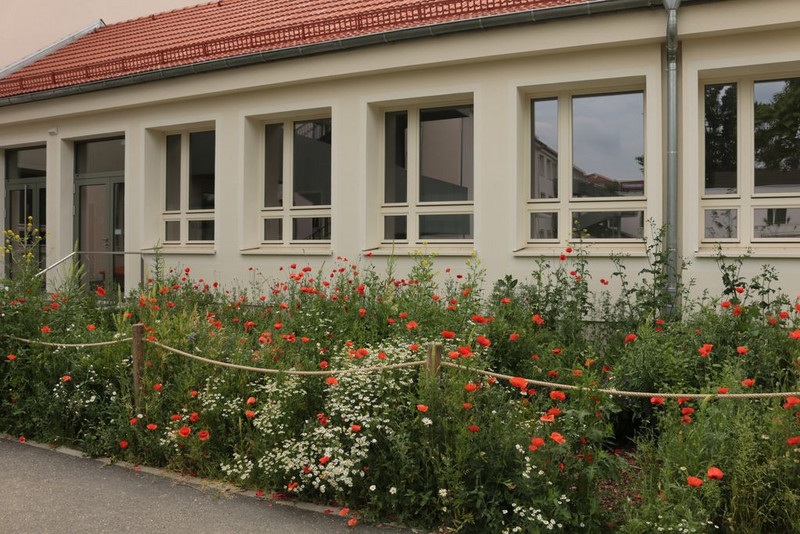 Die Baumaßnahmen sind zum Ende gekommen und unser Schulhof erstrahlt seit Beginn der Blütezeit immer wieder mit neuen Farben. Von zeitigen Frühblühern wie lila Krokusse bis zu Tulpen in zartgelb und schwarzlila, ging es weiter mit weißen und lila blühenden Pflanzen, wie z. B. Kugellauch und aktuell rosa Malvengewächse. Mal sehen, was uns noch überrascht. Auch die Außenbereiche um das Schulhaus herum haben uns ebenfalls überrascht - mit Mohnblumen, Kamillie u. v. a. m. Von dem einstmals so langweiligen und grauen Schulhof ist nichts mehr zu sehen.