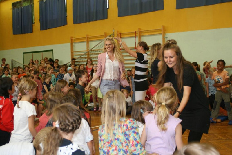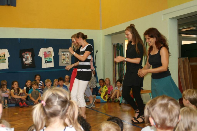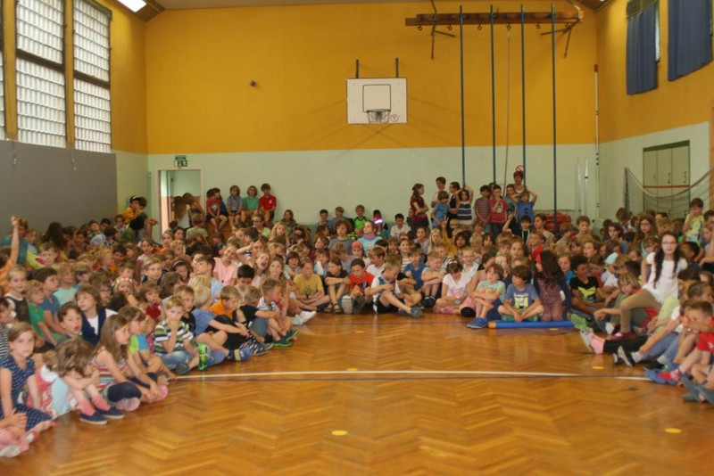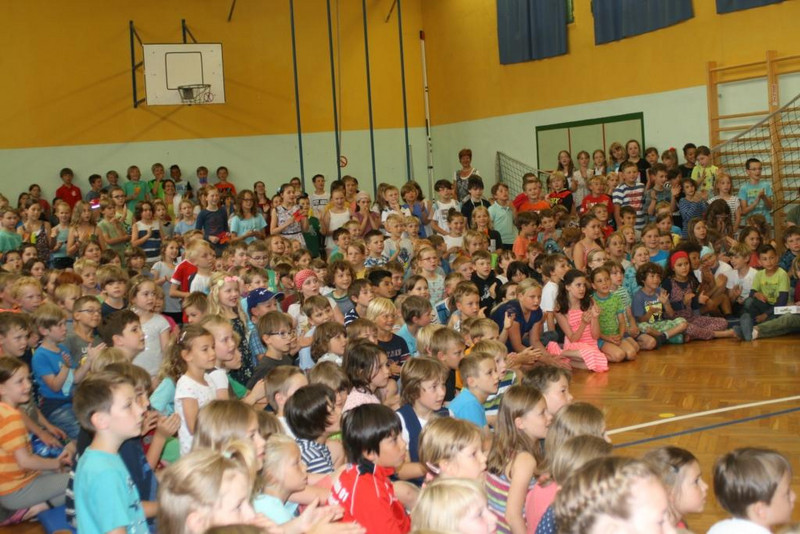 Am letzten Schultag treffen sich alle Schüler zum gemeinsamen Start in die Sommerferien in unserer Turnhalle. Diese platzt bei 420 Schüler nun langsam "aus allen Nähten".