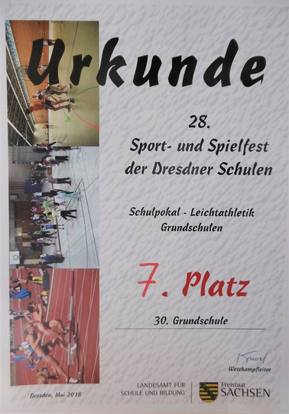 Auch in diesem Jahr hat die 30. Grundschule wieder erfolgreich am Leichtathletikwettkampf der Dresdner Grundschulen teilgenommen und den 7. Platz belegt! Die Jungs und Mädels der dritten und vierten Klasse haben trotz schlechter Übungsbedingungen ihr Bestes gegeben und kommen mit einem breiten Lächeln zurück.