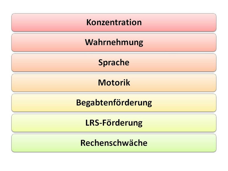 Dabei spielen Lernpatenschaften mit älteren Schülern eine wesentliche Rolle. Die Kopplung des Faches Werken mit dem Förderunterricht hat zur Folge, dass alle Schüler erreicht und leistungsdifferenziert gefördert werden. Durch die Öffnung an einem Wochentag werden Schwächen und Stärken der Schüler besonders beachtet. Langjährig stehen dabei folgende Bereiche im Mittelpunkt.