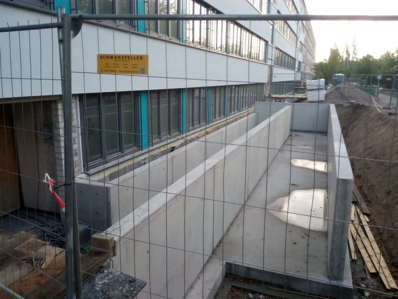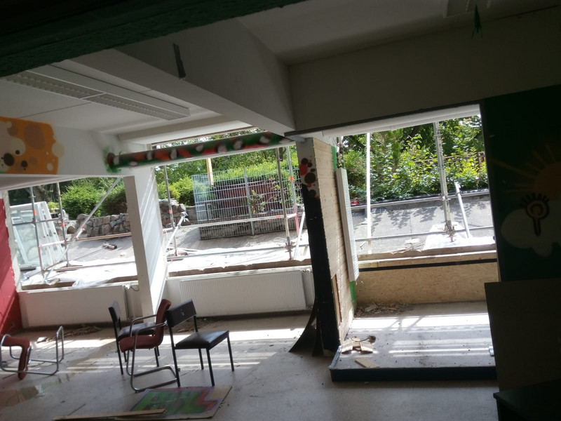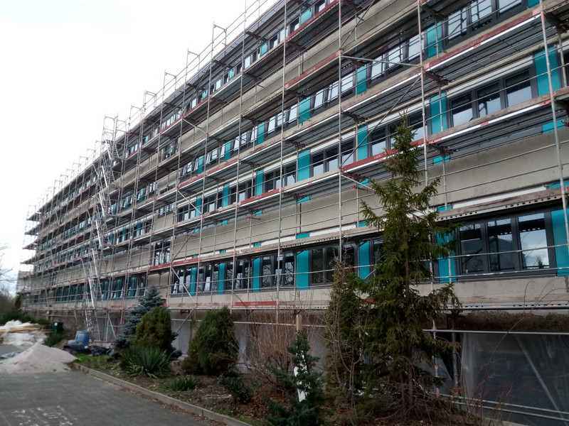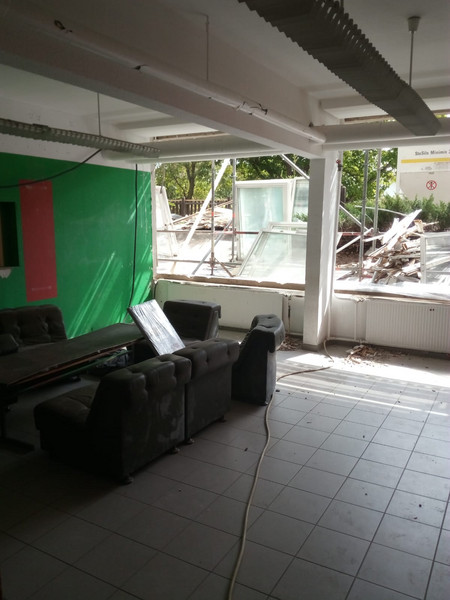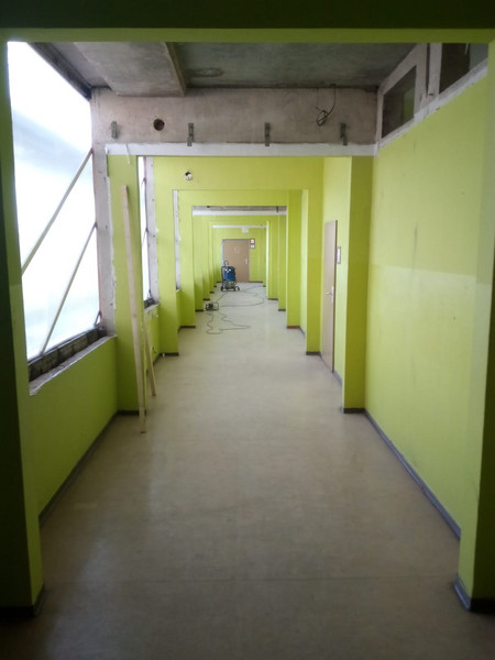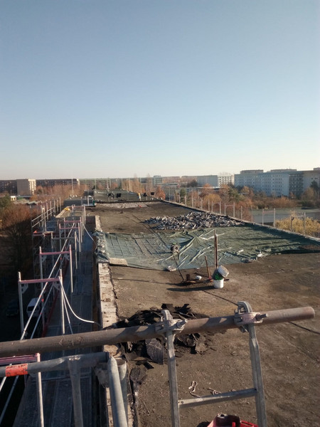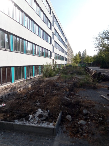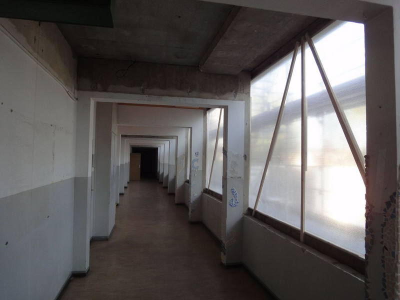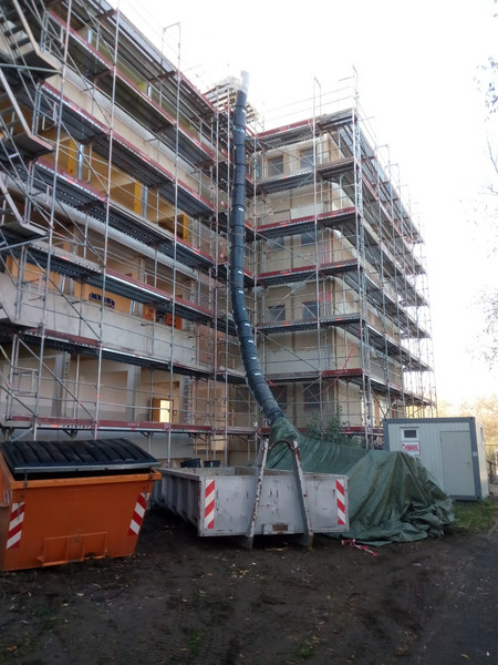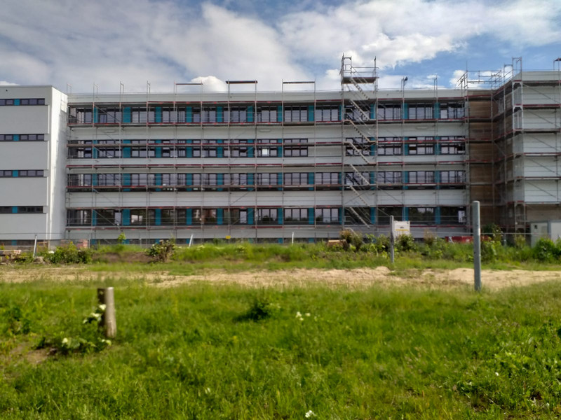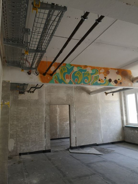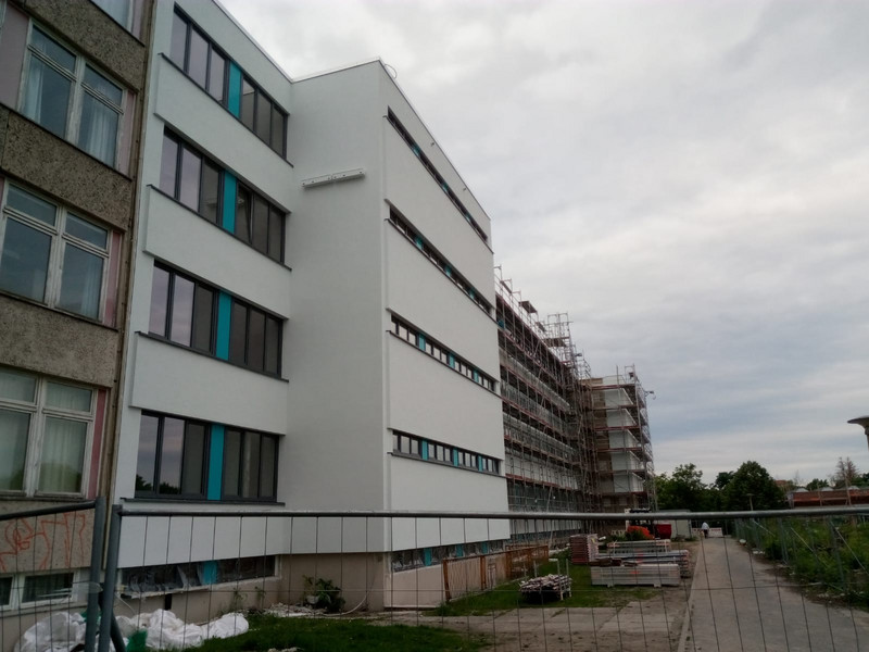 Viel ist von außen nicht mehr übrig. Keine Fenster, keine Kieselsteine an der Fassade. Türen und Decken sind auch bereits entfernt. Die großen Container schlucken alles, was durch die Schuttrutsche fällt. Im Inneren leuchten noch die Farben der Flure und erzählen von tollen Schüleraktionen.