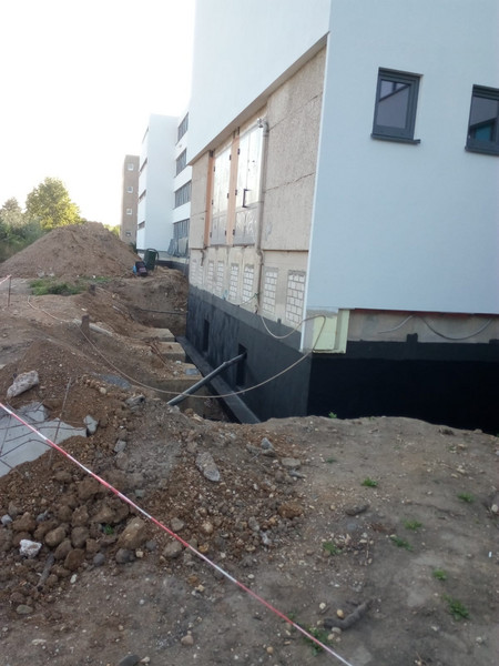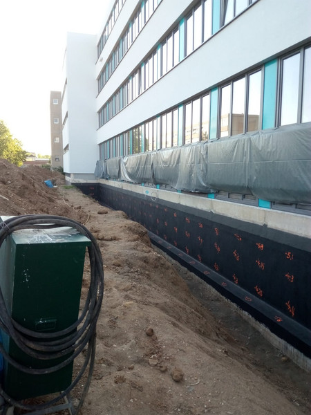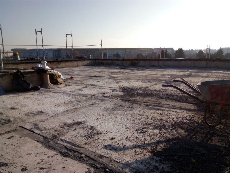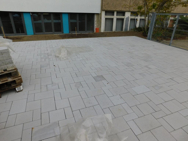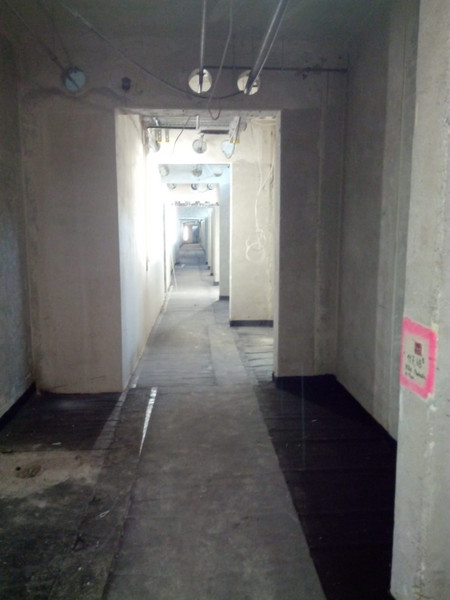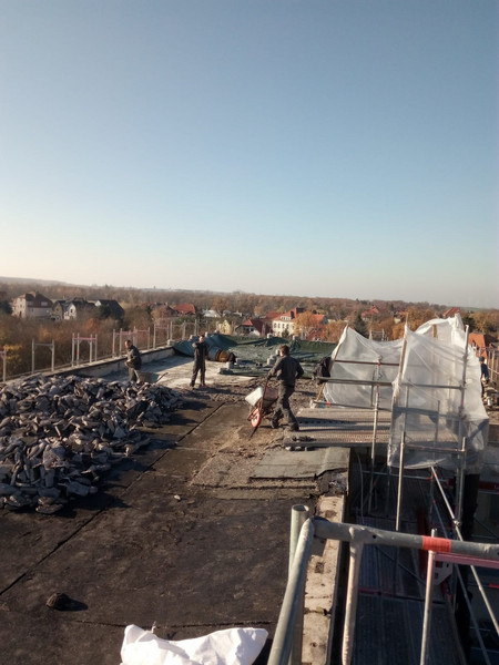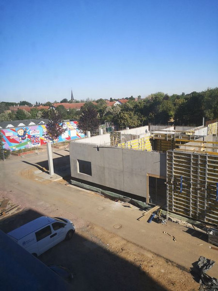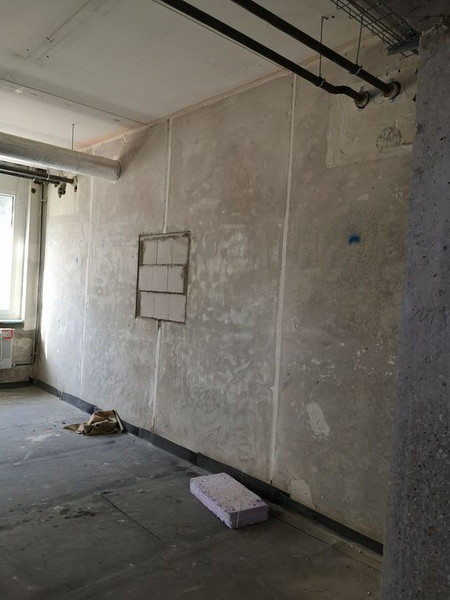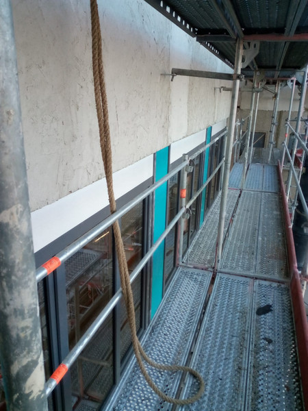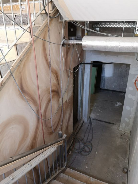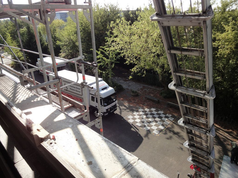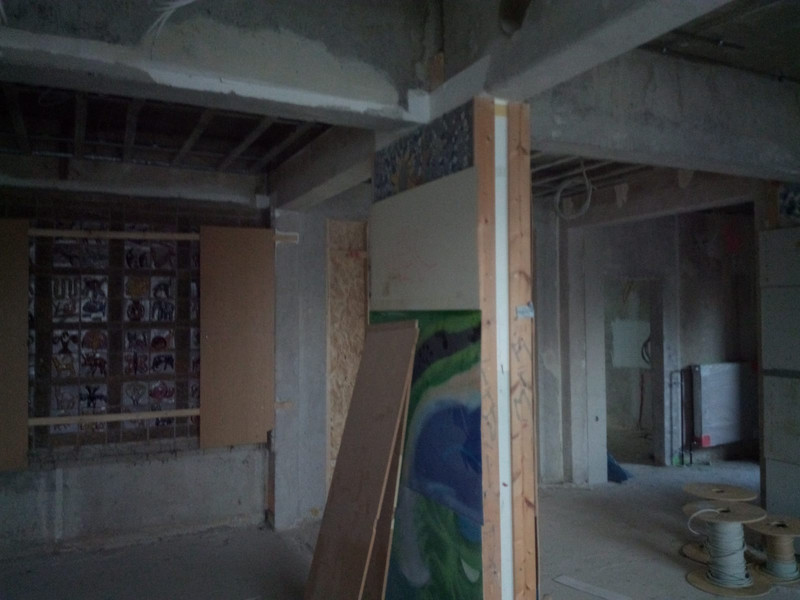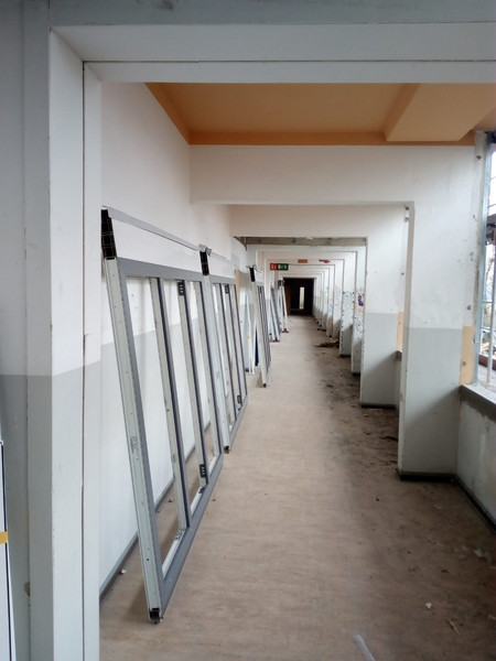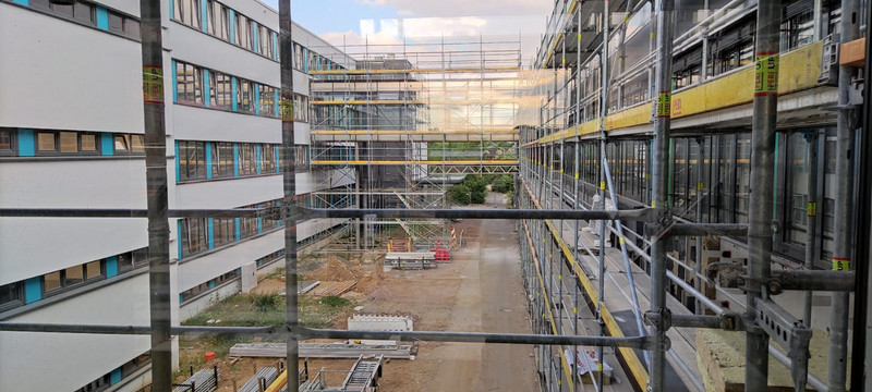 Viel ist von außen nicht mehr übrig. Keine Fenster, keine Kieselsteine an der Fassade. Türen und Decken sind auch bereits entfernt. Die großen Container schlucken alles, was durch die Schuttrutsche fällt. Im Inneren leuchten noch die Farben der Flure und erzählen von tollen Schüleraktionen.