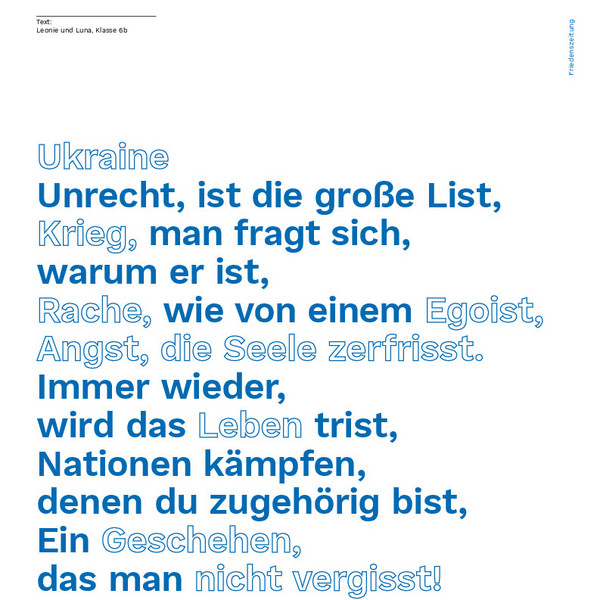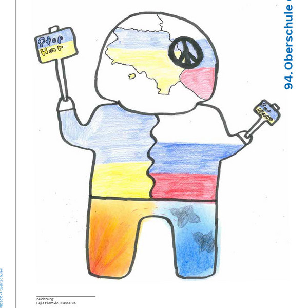 Von Beginn des Krieges am 24. Februar 2022 an hatten die Schülerinnen und Schüler deutschlandweit mit künstlerischen Mitteln sichtbare Zeichen der Solidarität mit der Ukraine gesetzt und ihren Protest gegen den russischen Angriffskrieg zum Ausdruck gebracht. Mit Blick auf das große künstlerisch-kreative Engagement veröffentlichte die Bundeskoordination der UNESCO-Projektschulen Mitte März 2022 einen Aufruf im Netzwerk, sich literarisch-künstlerisch mit Fragen von Krieg und Frieden in Unterrichts- und Schulprojekten zu befassen. Die Friedenszeitung bündelt die daraus hervorgegangenen Beiträge, die gemeinschaftlichen Klassenprojekte ebenso wie die persönlichen Formen der Auseinandersetzung mit dem Geschehen.“