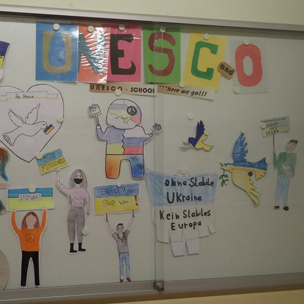 Nach dem 24.02.2022 initiierte die DUK einige Videokonferenzen des UPS-Netzwerks, um sich über Möglichkeiten der schulischen Bearbeitung des Kriegs auszutauschen und um das Schulnetzwerk weiterauszubauen und zu stärken. Dabei kam die Idee eines Friedensbuchs der UPS auf. Unsere Kunstlehrerin Frau Lindemann gestaltete mit ihren Klassen Bilder zum Krieg Russlands gegen die Ukraine und dem Wunsch nach Frieden. Einige der Bilder hängen noch immer im Schaukausten UNESCO aus.
