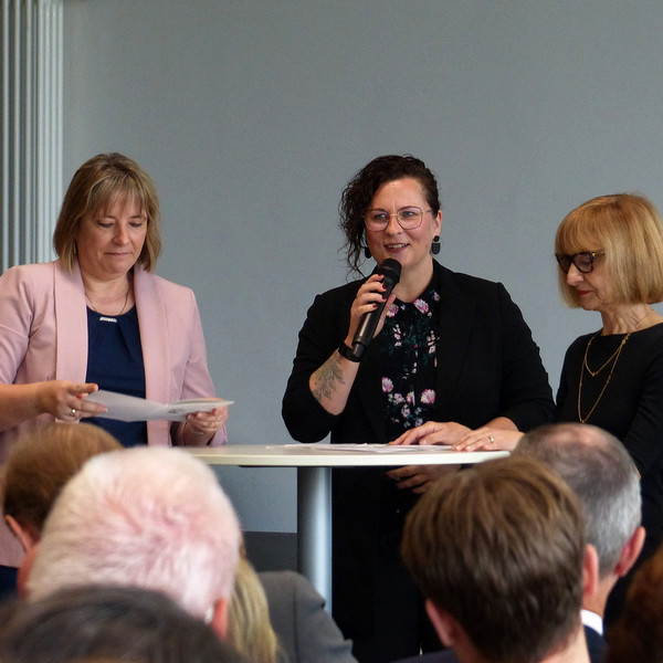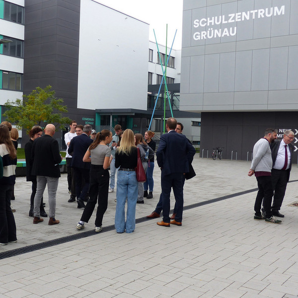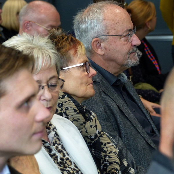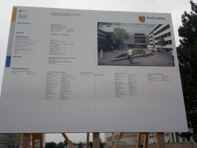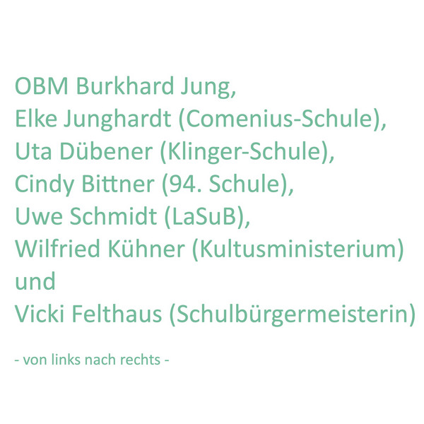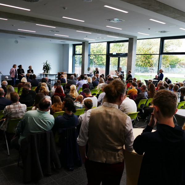 Im Raum fanden sich ca. 100 Menschen zusammen, die in ganz unterschiedlicher Weise mit der Planung und der Entstehung des Schulzentrums zu tun haben und hatten. Ein (ehemaliger) Abgeordneter der Linken erzählte, wie er vor einigen Jahrzehnten für den Erhalt der Gebäude gekämpft hat, das Publikum lauschte dem OBM, der glücklich ist, einen solchen Schulstandort in Grünau zu wissen. Herr Kühner, stellvertretend für Herrn Piwarz, beglückwünschte uns von Seiten des SMK und stellte die Chancen der Zusammenarbeit der Schulen heraus. Schöne und „persönliche“ Worte für jede einzelne Schule fand Herr Schmidt (ehemaliger SL vom Gerda Taro-Gymnasiums, nun im LaSuB), der als Vertreter für Herrn Heinold anwesend war. Wir drei Schulleitungen ließen es uns letztlich aber nicht nehmen, mit kleinen, humorvollen Spitzen auf die Gesamtsituation hinzuweisen, die alle drei Schulen durchleben mussten.