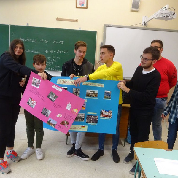 Bevor wir uns am Montag, den 18.09. in den Unterricht stürzten, begrüßten wir im Lehrerzimmer das Kollegium. Dabei überreichten wir unsere Gastgeschenke. Darunter Steckbriefe zu Ungarn aus dem Geografieunterricht von Frau Rüschmann, Briefe der Klasse 7A von Frau Schmelzer sowie das aktuelle UNESCO-Jahrbuch und die Stolpersteindokumentation. Worauf alle Lehrer, Deutsche wie Ungarische, besonders stolz sind, ist die überreichte Einladung für 10 Schüler und 4 Lehrer zum UNESCO-Schülercamp vom 24.04.-27.04.2018. An unserer Schule werden sie gemeinsam mit Schülern und Lehrern der sächsischen UNESCO-Projektschulen zum Thema Gesundheit lernen.