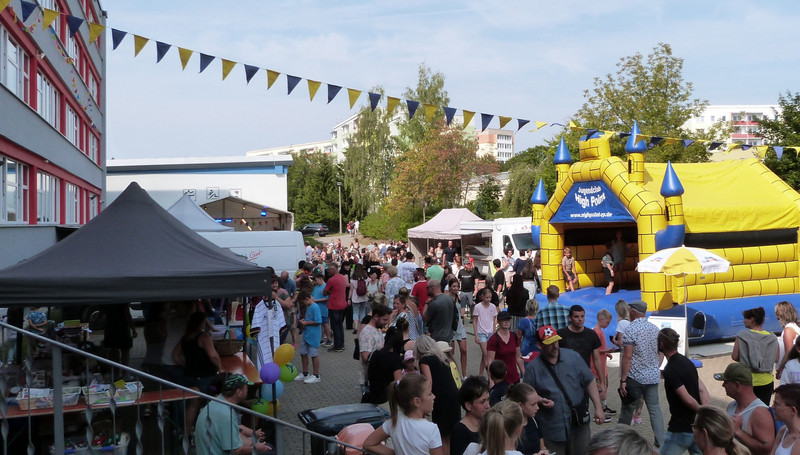 Am 31.08.2024 feierten wir gemeinsam mit rund 1500 Gästen unser 40-jähriges Schuljubiläum. Während auf dem Schulhof ein großes Talentefest stattfand, war auch im Schulhaus so einiges los. Ein Wandel durch die Zeit – in jeder Etage ein anderer Schwerpunkt. Erinnerungen wurden in der ersten Etage geweckt. Bei alten Videoaufnahmen und ordnerweise Fotos traf sich so manch Ehemaliger auf ein Schwätzchen. Der Blick in die Gegenwart in der zweiten Etage offenbarte, was an der ABOS aktuell alles passiert. Neben dem Fächerverbindenden Unterricht und der Ausstellung zahlreicher Projektergebnisse, konnte Einblick in den heutigen Schulalltag gewonnen werden. Im Zukunftsflur, in der vierten Etage, standen vor allem die Themen Demokratieerziehung, Bildung für nachhaltige Entwicklung und Digitales Lernen im Fokus. Dumpfe Bässe schalten aus dem Musikzimmer, in dem ein offener Trommelworkshop mit dem Chemnitzer Friedenspreisträger Abar Manillah stattfand. Nebenan wurden Stoffbeutel – unsere eigenen “Bebelbeutel” – bedruckt, um Nachhaltigkeit auch in den Schulalltag zu integrieren. Und unsere Schülerinnen und Schüler zeigten Interessierten, wie man Roboter durch die Gegend sausen lassen kann.