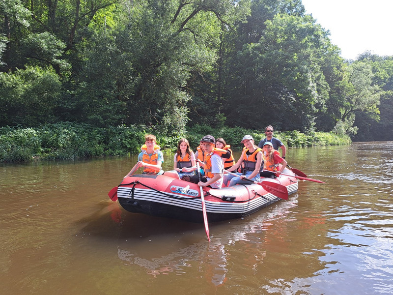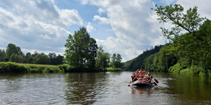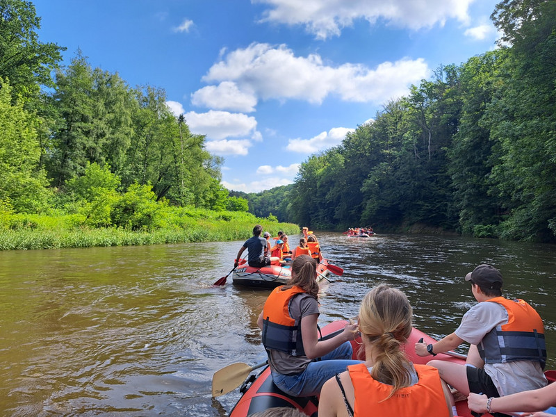 Die Mulde zeigte sich an diesem Tag von ihrer besten Seite. Mit einer schnellen Strömung, die uns förmlich davontrug, genossen wir die atemberaubende Landschaft und das fröhliche Miteinander. In den Schlauchbooten wurde gescherzt, gelacht und auch mal ordentlich gepaddelt, um den ein oder anderen kleinen Wettkampf zu gewinnen. Der Tag endete mit einem kleinen Grillbuffet am Ufer.