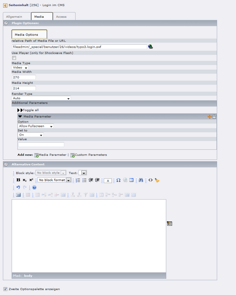 Fügen Sie in der gewünschten Seite eine neues Inhaltselement ein und wählen Sie "Spezielle Elemente". Hier können Sie nun "Medien" auswählen und dann die gewünschte (vorher hochgeladene) Mediendatei angeben. Durch das Setzen von Parametern können Sie das Erscheinungsbild und Verhalten des Mediums beeinflussen.