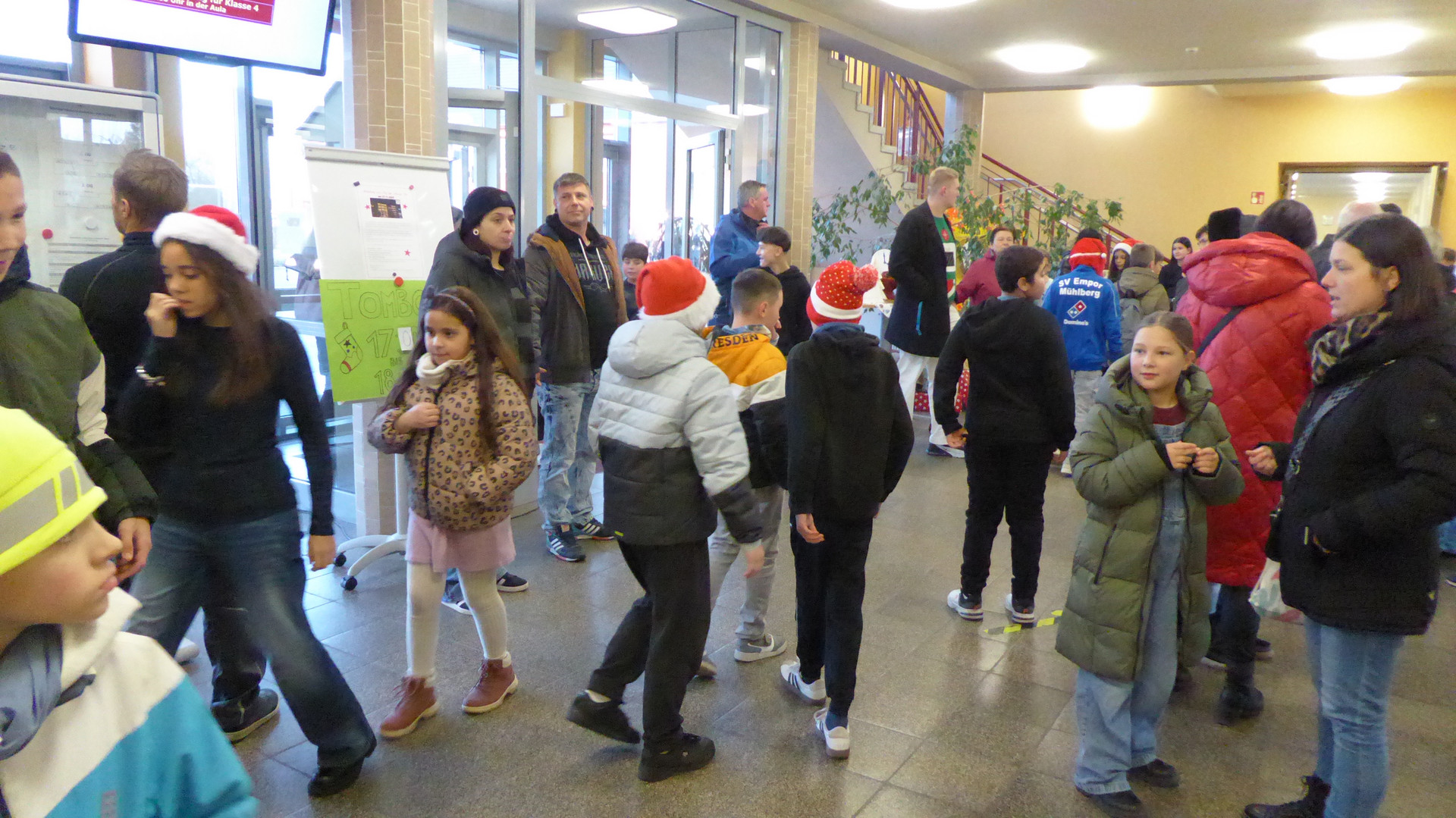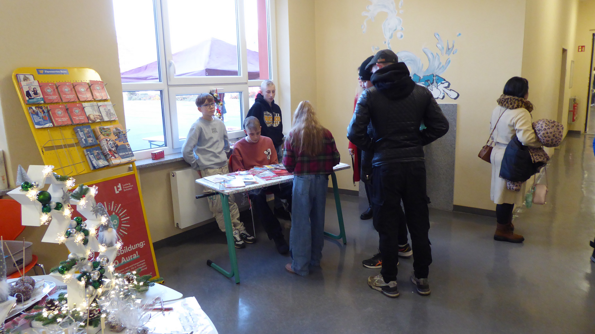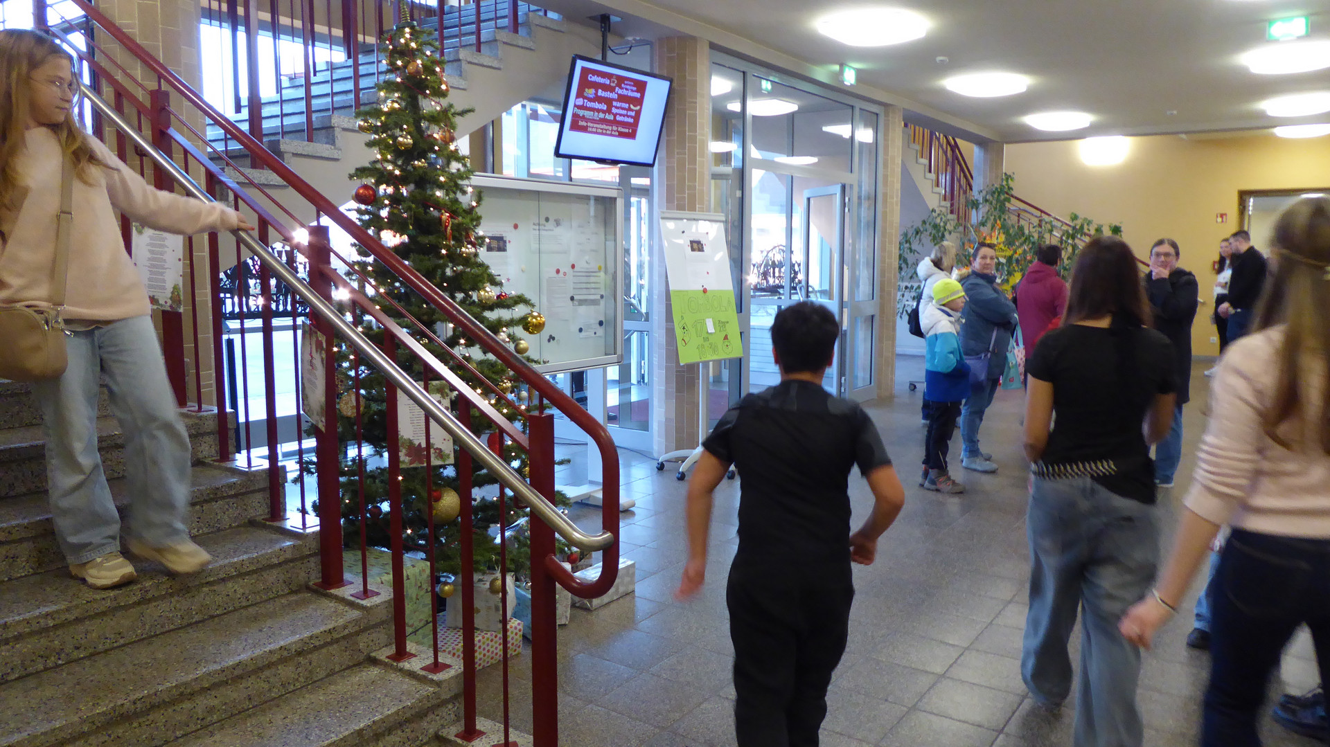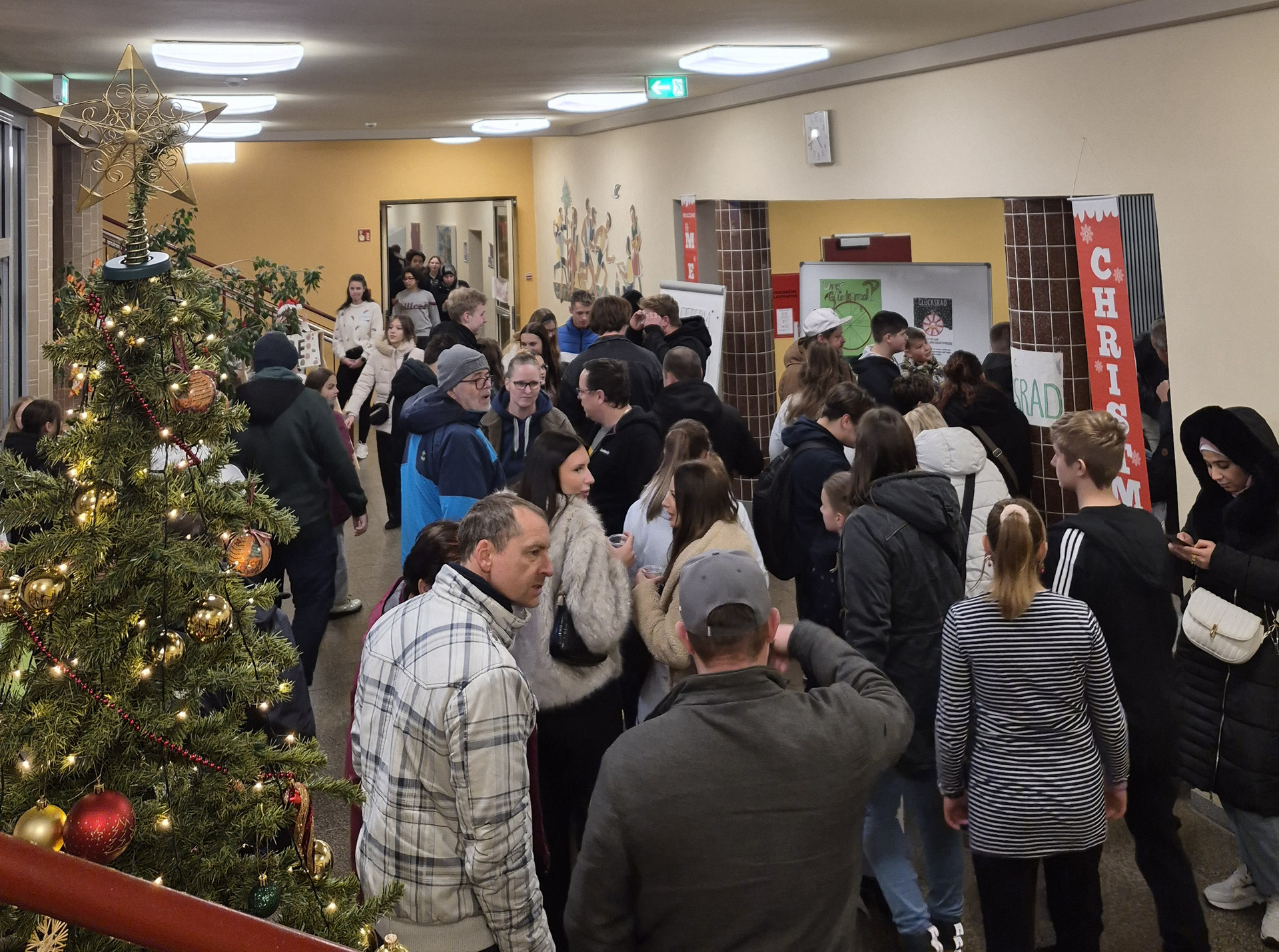 Am 27.11.2025 öffneten sich die Türen unserer Schule für alle Besucher. Es waren viele Eltern auf Entdeckungstour, ehemalige Schüler und Lehrkräfte auf Erinnerungstour und alle nahmen den Flair unseres "Weihnachtszaubers" auf. Für Besucher, die unsere Schule noch nicht kannten, gab es Führungen. Rege besucht wurden die von unseren Schülern liebevoll hergerichteten Stände, Essen- und Getränkestände, das Glücksrad, die Tombola, die Fotobox, das sportliche Mitmach-Angebot sowie unser Bühnenprogramm in der Aula.