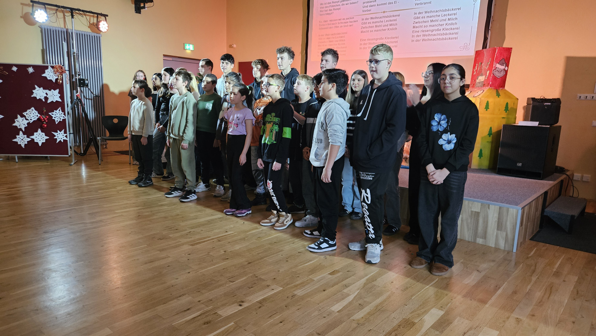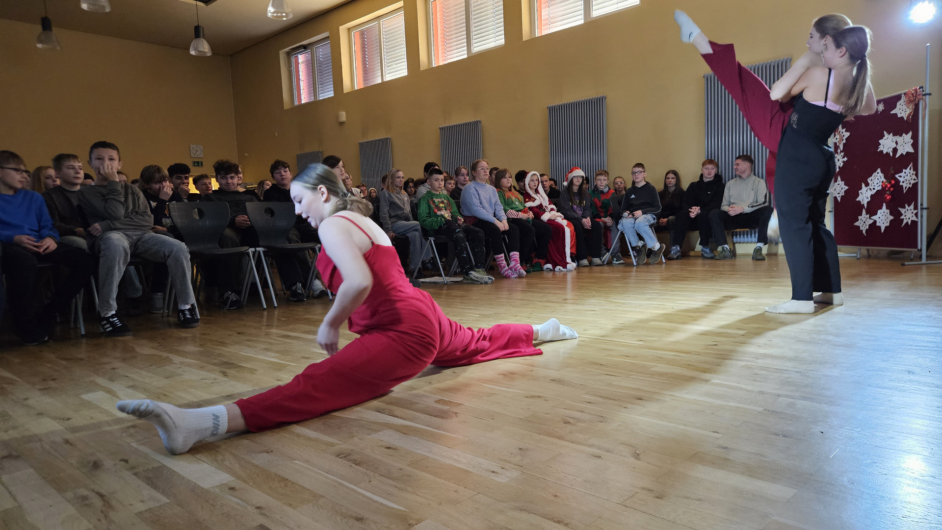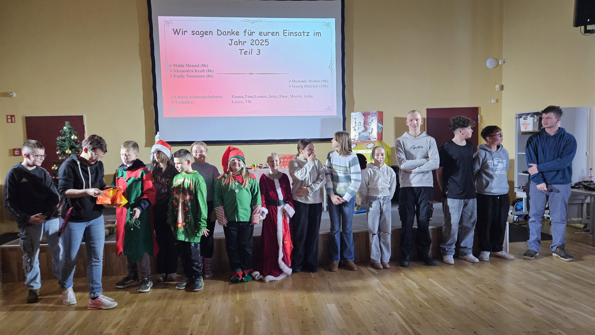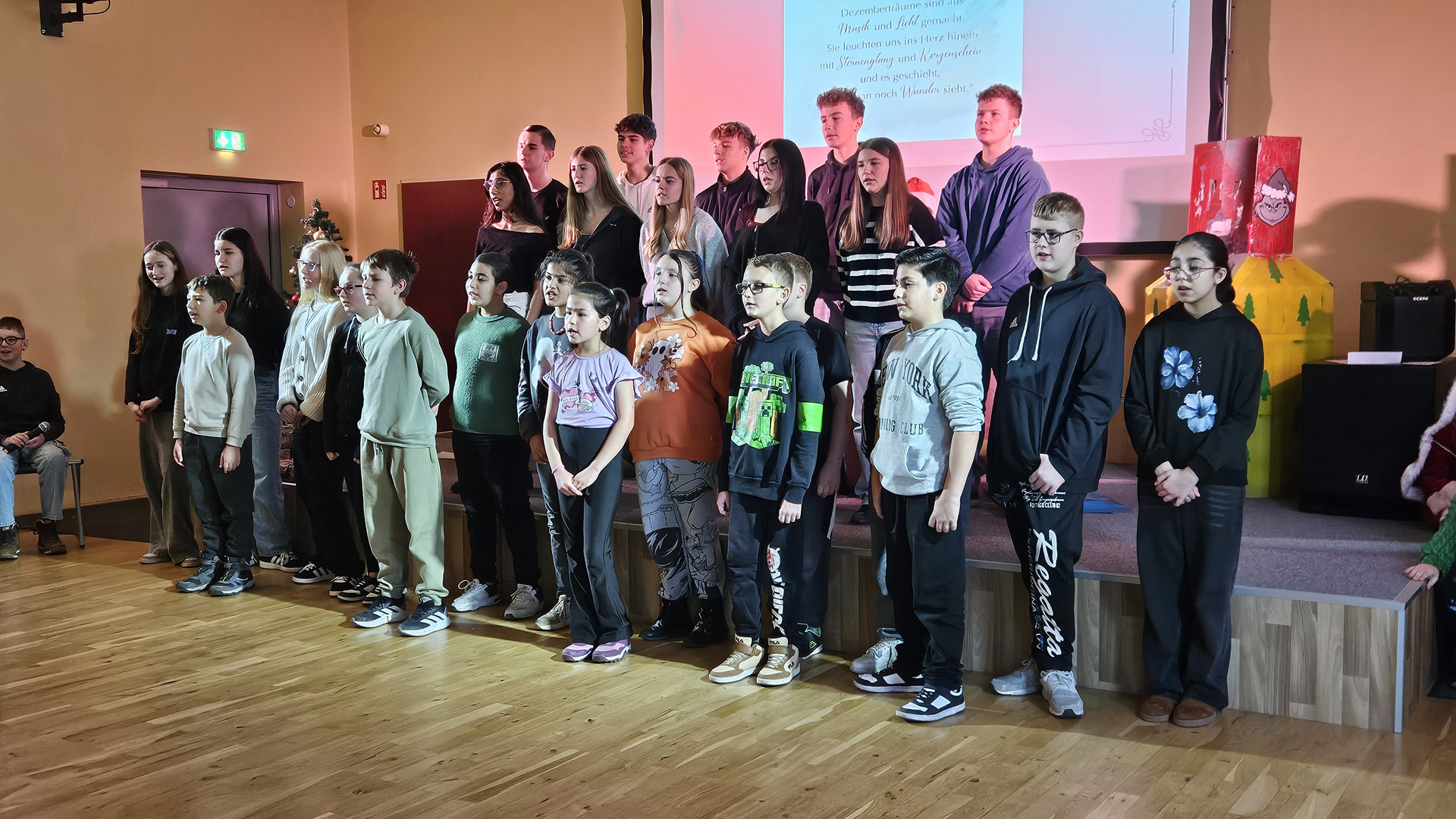 Am 19. Dezember 2025 fand am letzten Schultag vor den Weihnachtsferien traditionell das Zusammenkommen aller Schüler in der Aula statt. Das Programm bestand aus einem tänzerischen, schauspielerischen und musikalischen Teil. Bei den Auszeichnungen für besonders engagierte Leistungen gab es ebenfalls viel Applaus.
