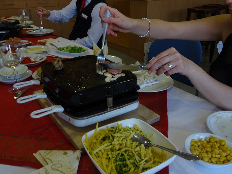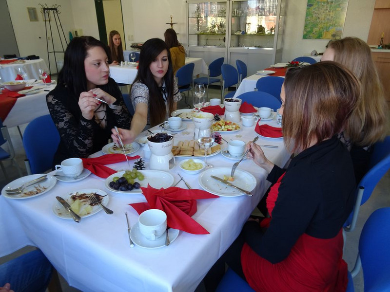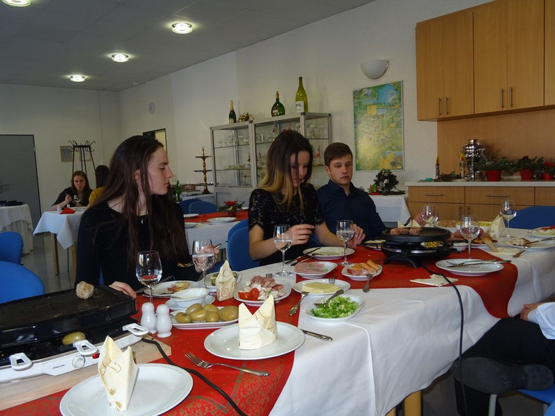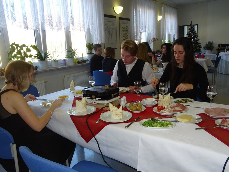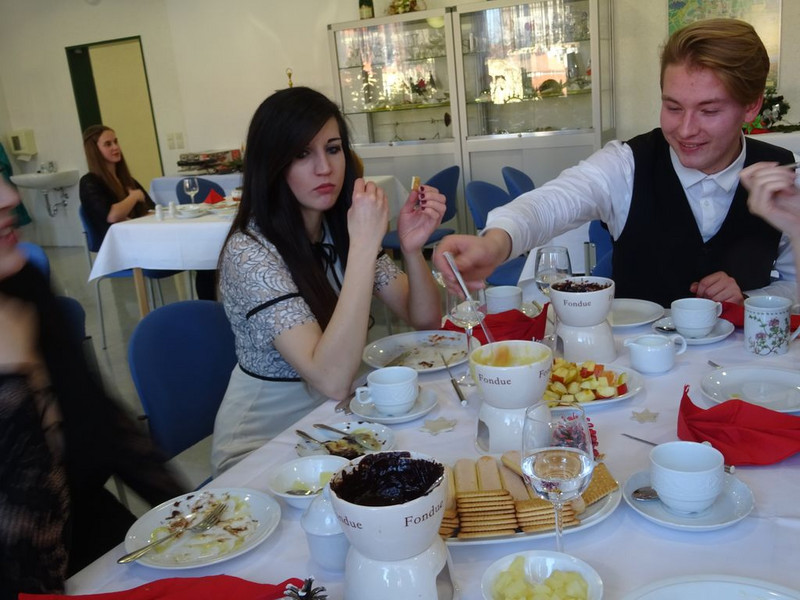 Am 13.12.2017 kochten sich die Schüler der RF/HF/FKG 17 ihr Essen am Tisch. Passend zur weihnachtlichen Saison wurden die Tafeln festlich eingedeckt und verschiedene Raclette- und Fondue-Varianten mit Fleisch, Käse und Schokolade fachgerecht vorbereitet und leidenschaftlich verkostet.