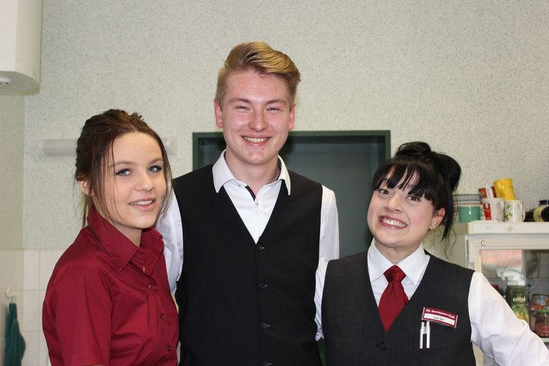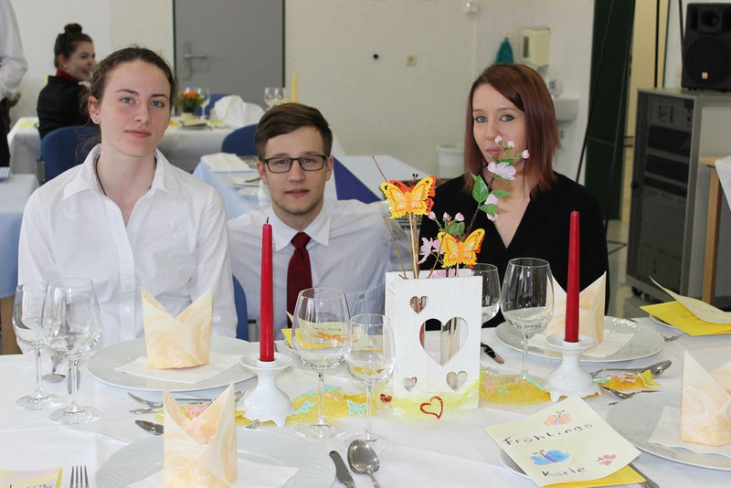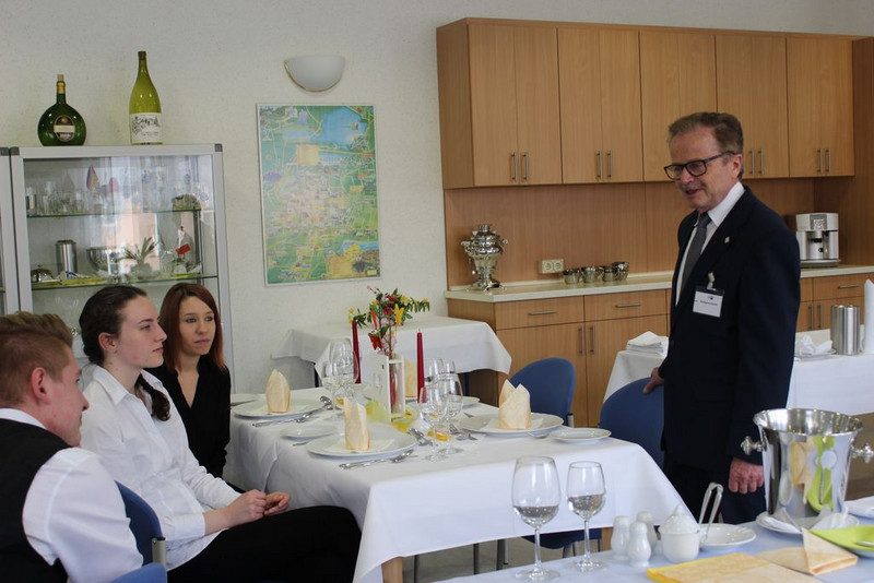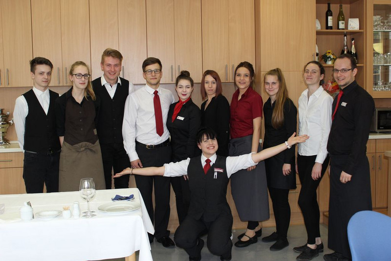 Im Service arbeiteten die Schüler der Ausbildungsberufe Hotel- und Restaurantfachmann sowie Fachkraft im Gastgewerbe. Sie hatten eine themengerechte Tafel eingedeckt, die Menüfolge gelernt und deren Verkündung geübt.