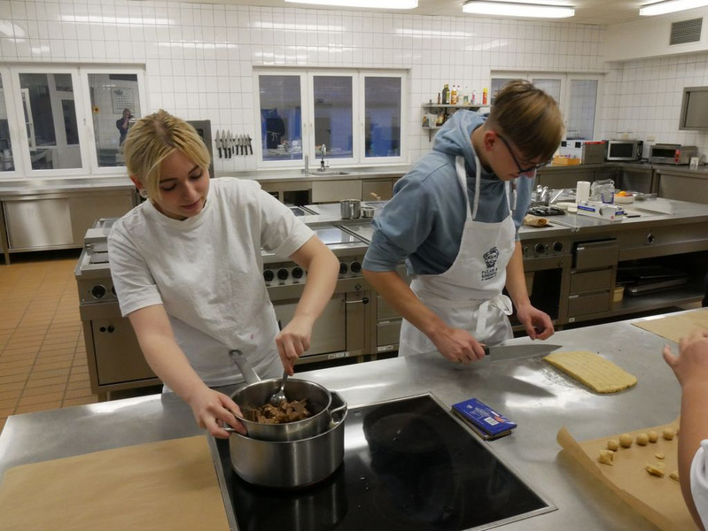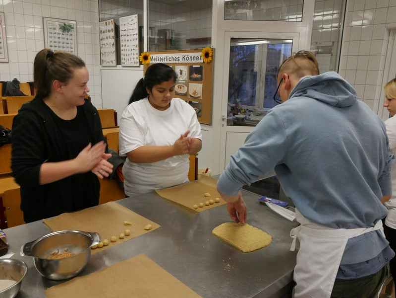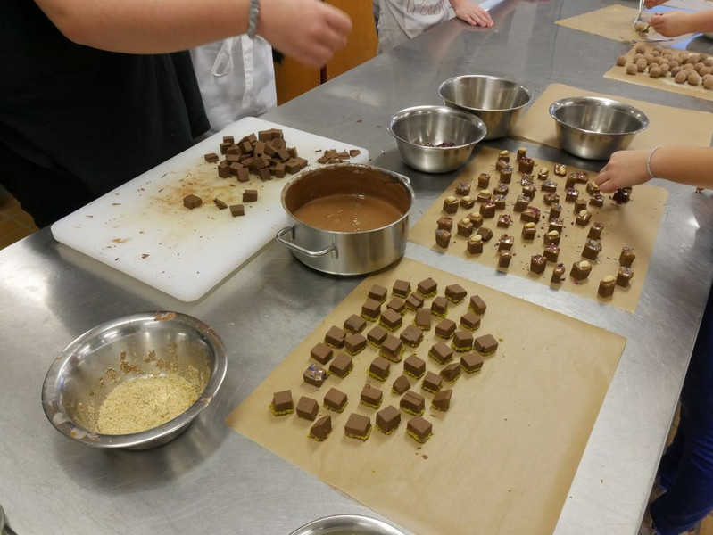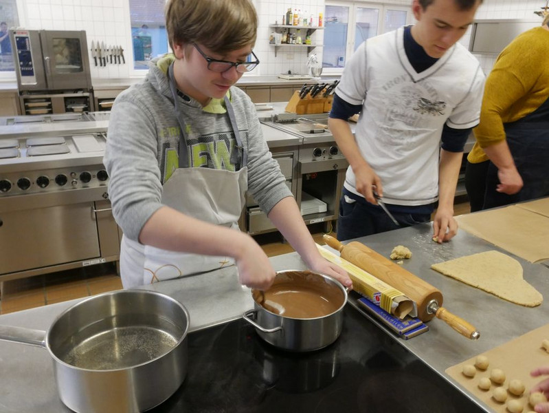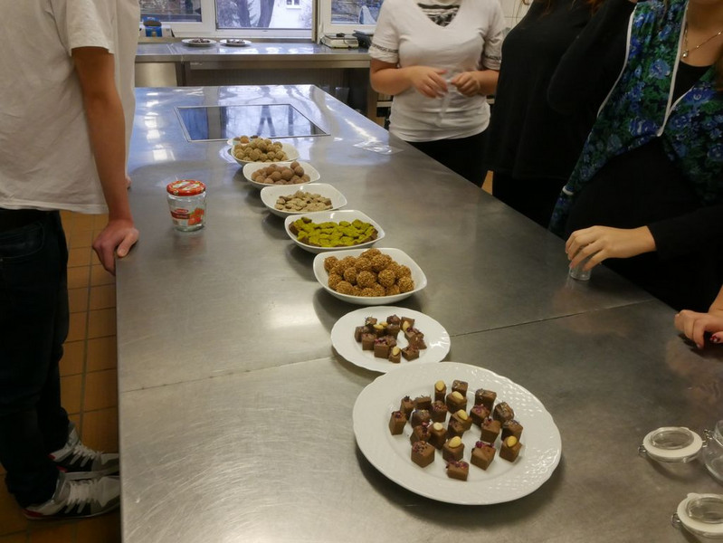 Man nehme Schokolade, Marzipan, Nugat, Krokant, Pistazien, Mandeln… und fertige daraus leckere, weihnachtliche Pralinen. Wie jedes Jahr ging es - in den BVB Klassen kurz vor dem dritten Advent – wieder „rund um die Praline“. Rezepturen wurden gelesen, Preise ermittelt, Teig geknetet, Schokolade geschmolzen, Pralinen dekoriert, verziert und weihnachtlich verpackt.
