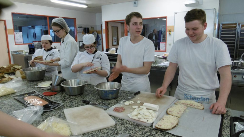 Den Mittwochvormittag verbrachten wir damit uns gegenseitig Vokabeln bei zu bringen, welche wir später zum Backen benötigen würden. Nach dem Mittagessen ging es in die Backstube, wo wir für den nächsten Tag Teige und Massen vorbereiteten. Am Abend gingen wir alle gemeinsam in die Stadt um dort Kebab zu essen.