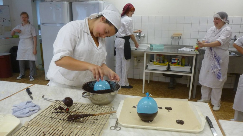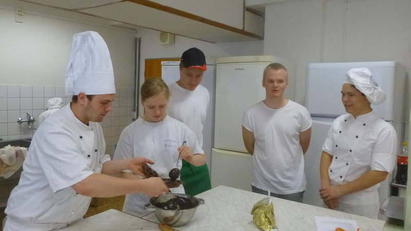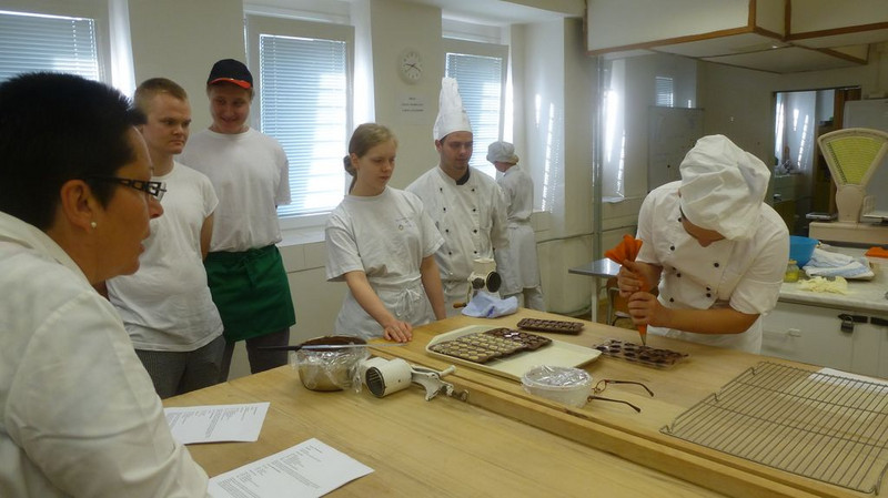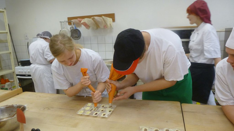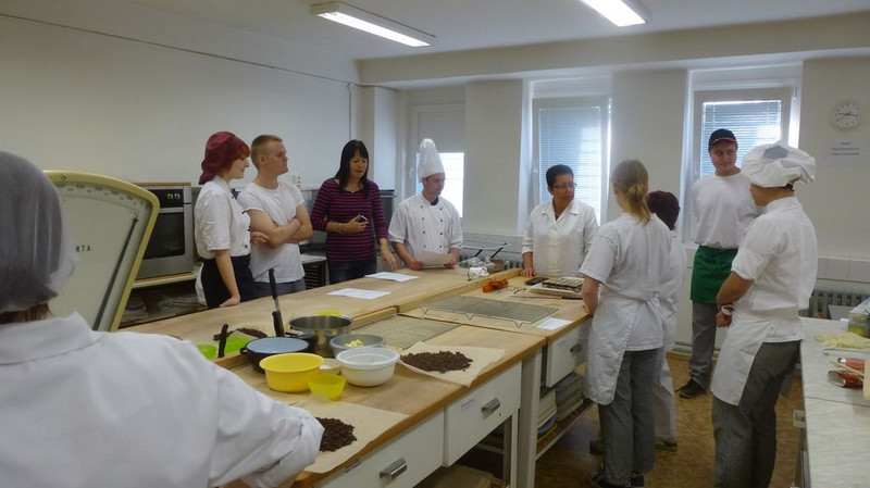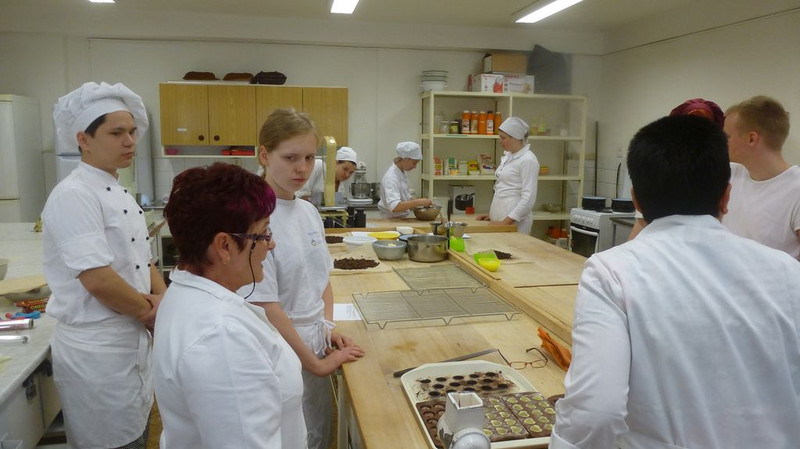 Auf dem Arbeitsplan stand die Herstellung von Pralinen. Dies verlangte unseren Schülern jede Menge Feingefühl ab. Sie wurden unterstützt durch die Lehrer und Schüler unserer Partnerschule, die ihnen geduldig die Grundtechniken der Pralinenherstellung zeigten.