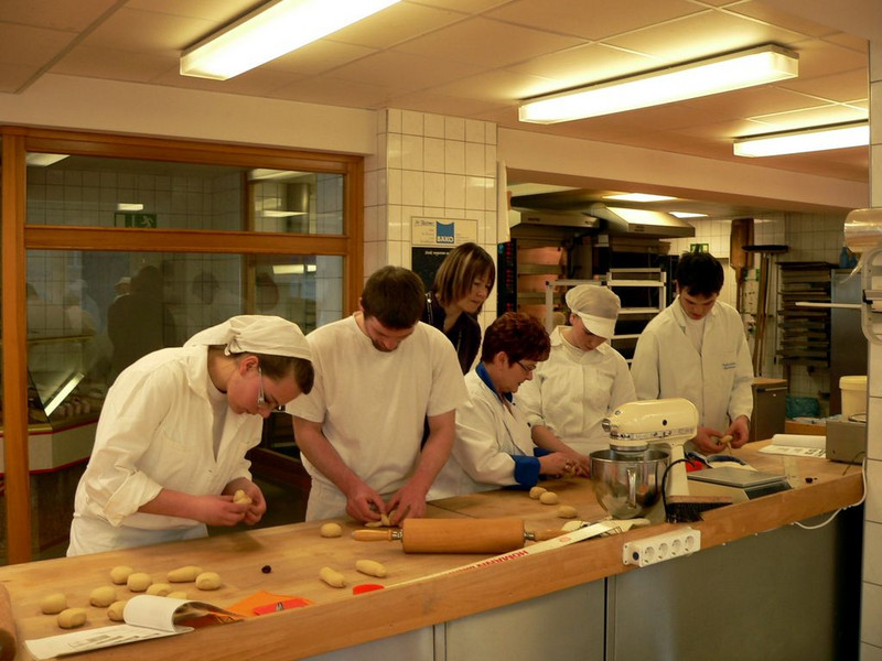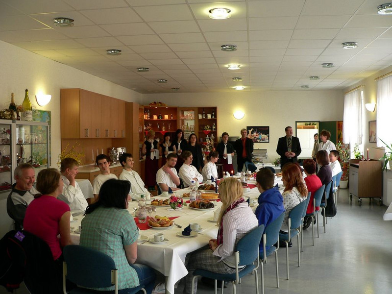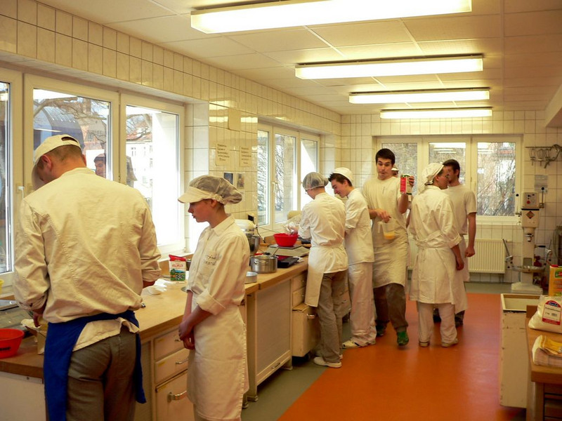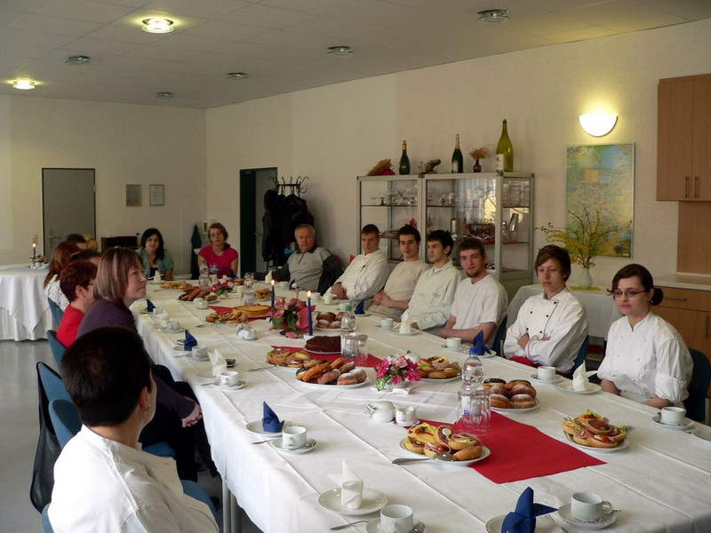 Die Stimmung war ausgelassen und wir hatten alle eine Menge Spaß. Verständigt haben wir uns mit Händen und Füßen, denn wir konnten kein Tschechisch und die Schüler aus Ceska Lipa kaum ein Wort Deutsch. Gegen 12.00 Uhr gab es ein gemeinsames Mittagessen. Nach getaner Arbeit wurde am späten Nachmittag die hergestellten Backwaren zusammen verkostet. Gegen 17.00 Uhr fuhren unsere tschechischen Gäste wieder nach Hause.