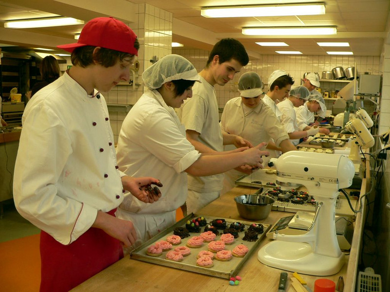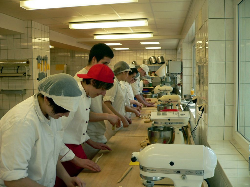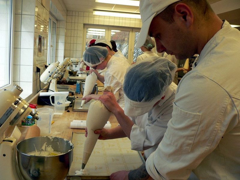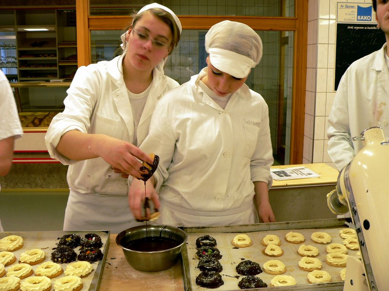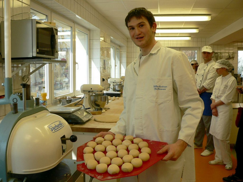 Wir begrüßten uns alle und frühstückten gemeinsam. Betreut und bekocht wurden wir von Schülern des BVJ und Kochlehrlingen der Klasse Kö 09a unserer Schule. Als sich alle gestärkt hatten, gingen wir gemeinsam in die Backstube zur praktischen Arbeit. Herr Bär erklärte den Ablauf. Wir stellten Teigvögel, Schaumvögel, Kremnester und Kremvögel her.