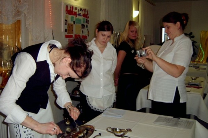 Im Restaurant arbeiteten die Auszubildenden im speziellen Service. Sie flambierten Pfirsiche und Crepes, filetierten Forellen und tranchierten Geflügel. Der Serviceablauf und die Fachlichkeiten waren landestypisch und daher für alle sehr interessant.