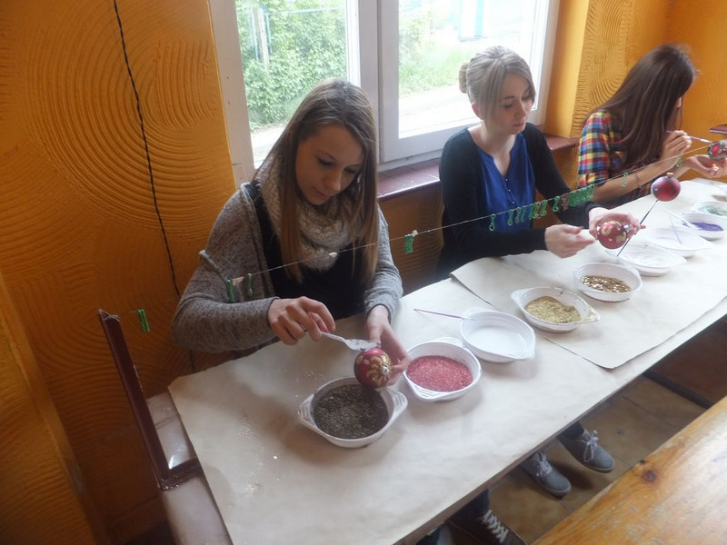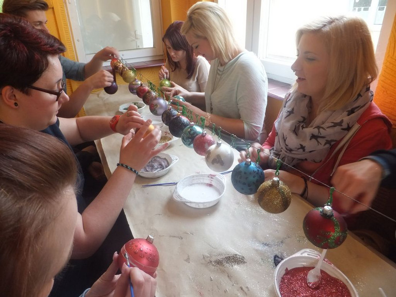 Außerdem besuchten wir das Unternehmen Vitbis P.P.H., das Weihnachtsbaumkugeln in Handarbeit herstellt. Wir durften unsere eigenen Weihnachtsbaumkugeln mit Leim und Glitzer gestalten. Wir waren sehr kreativ und hatten großen Spaß dabei. Das war das Highlight des Tages, da wir am Ende mehr glitzerten als die Kugeln. Durch die gemeinsame Arbeit in Gruppen konnten wir uns besser kennenlernen. Gemeinsam besichtigten wir danach die Produktion und erfuhren viel über die Herstellung der Weihnachtskugeln.