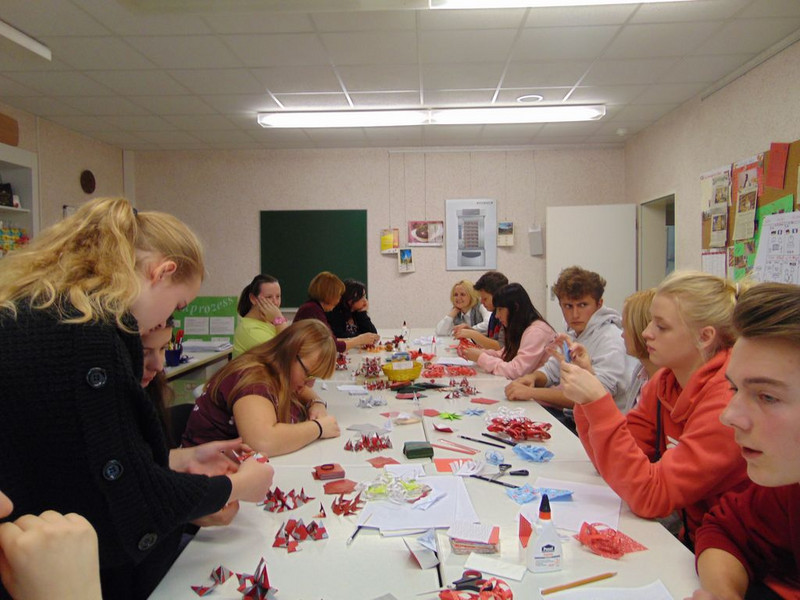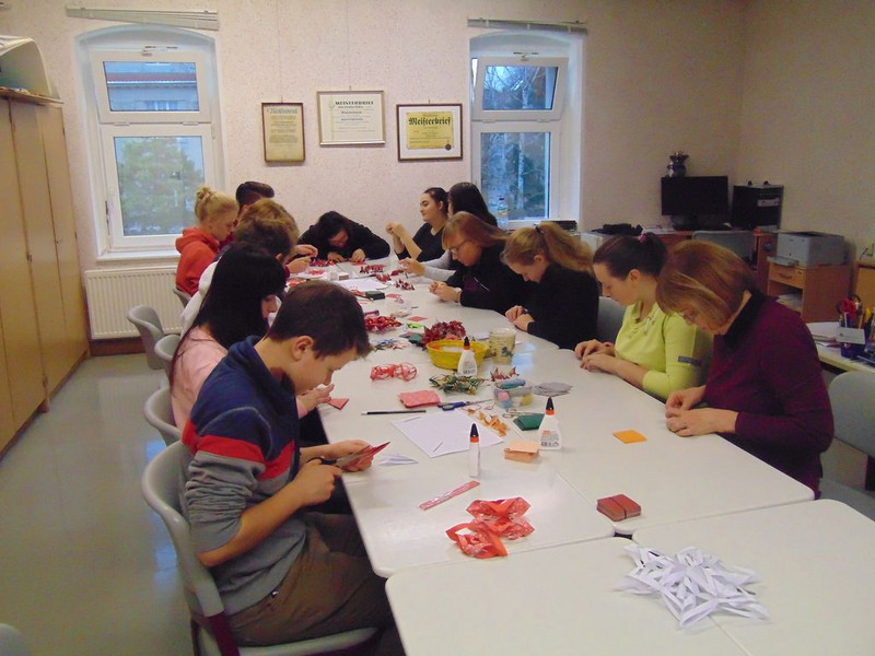 In einem zweiten Projekt wurde gemeinsam Weihnachtsdekoration gebastelt. Trotz Verständigungsschwierigkeiten konnten zahlreiche Weihnachtssterne fertiggestellt werden, da das durch Zeigen und Vormachen realisierbar war. Bei beiden Projekten erhielten die Gäste Unterstützung durch unsere Auszubildenden.