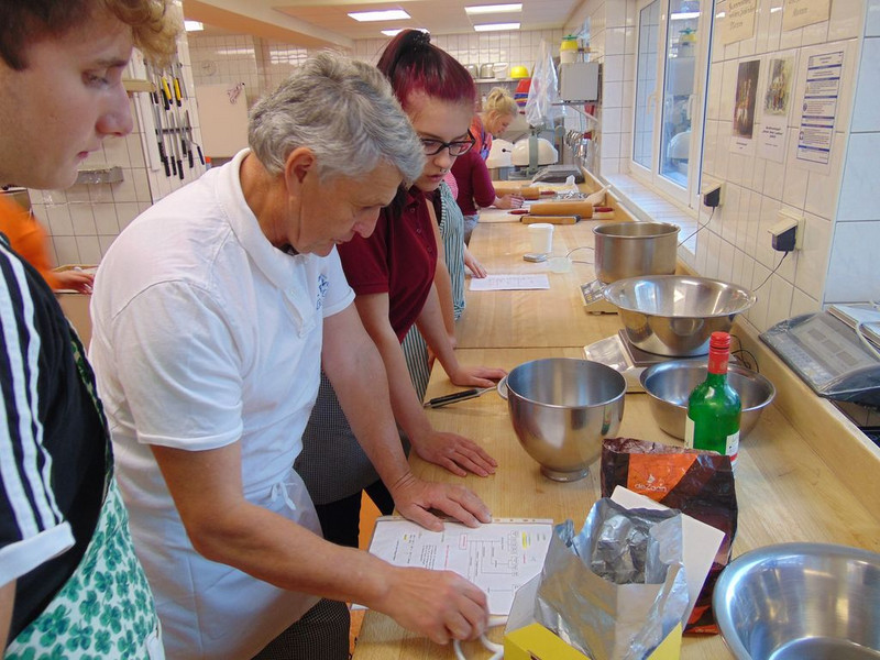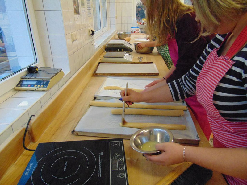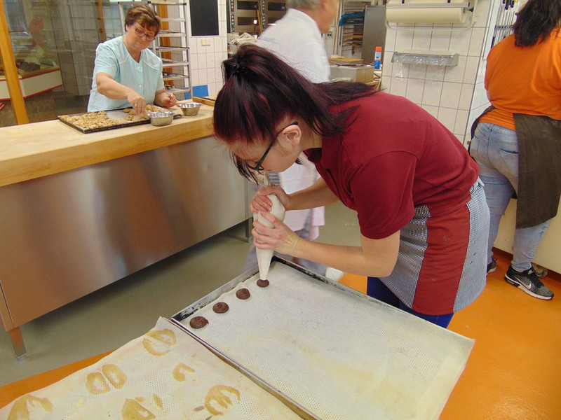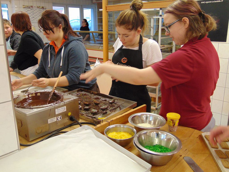 Nach dem gemeinsamen Frühstück ging es an die Arbeit. In der Backstube wurde zusammen Weihnachtsgebäck hergestellt. Dabei wurden alle Rezepte und Anweisungen in deutscher Sprache vorgegeben. So konnten die polnischen Schüler ihre Deutschkenntnisse und ihre Kenntnisse über den Umgang mit Lebensmitteln anwenden und erweitern.
