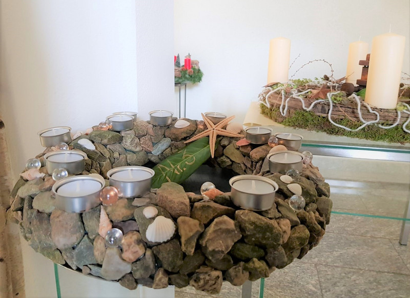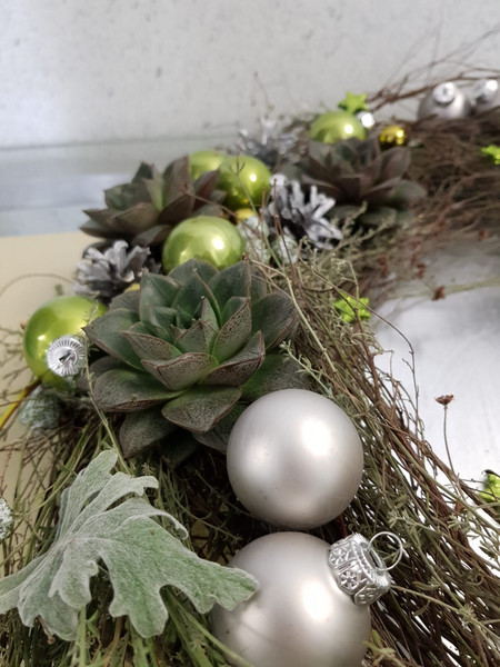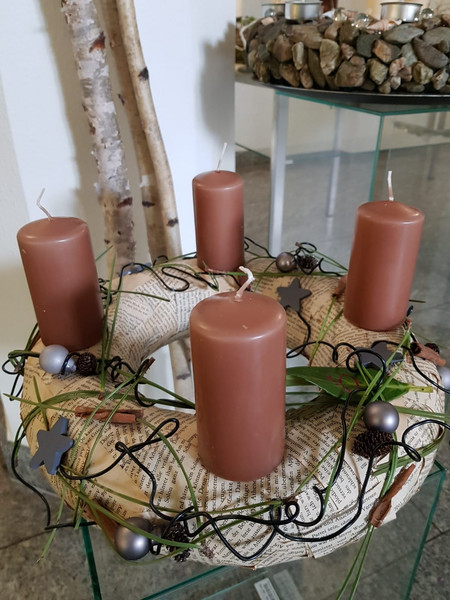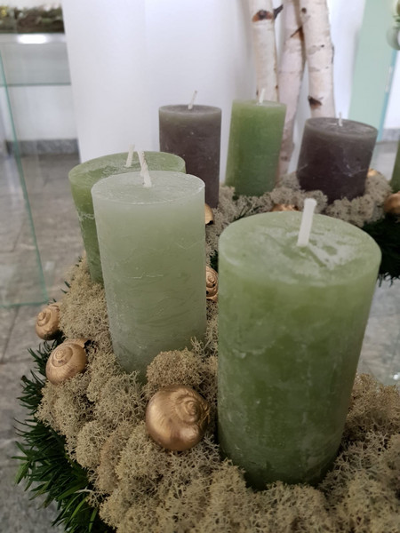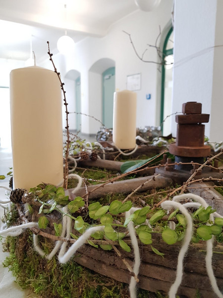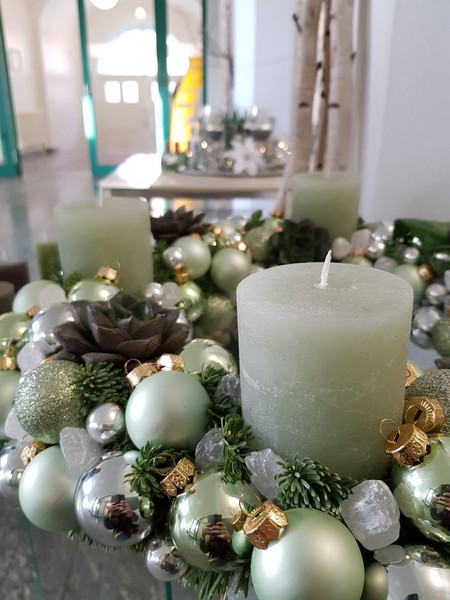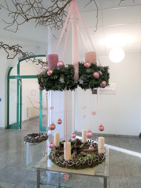 Unsere Auszubildenden im zweiten Lehrjahr im Beruf "Florist/in" stimmen in unserem Foyer durch ihre kreativen Adventskränze auf die Weihnachtszeit ein.