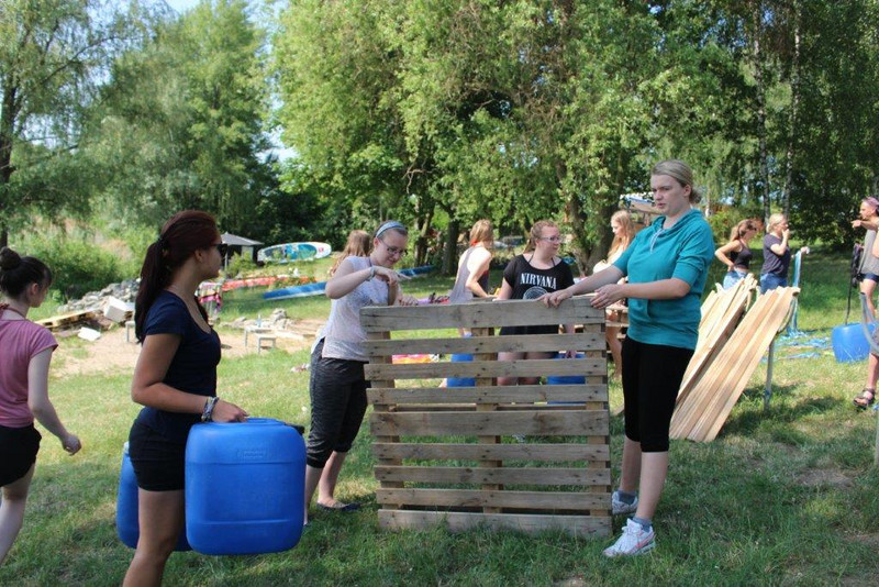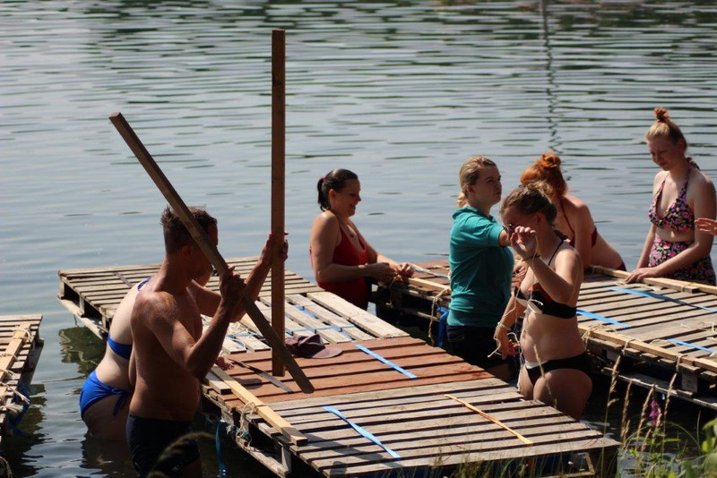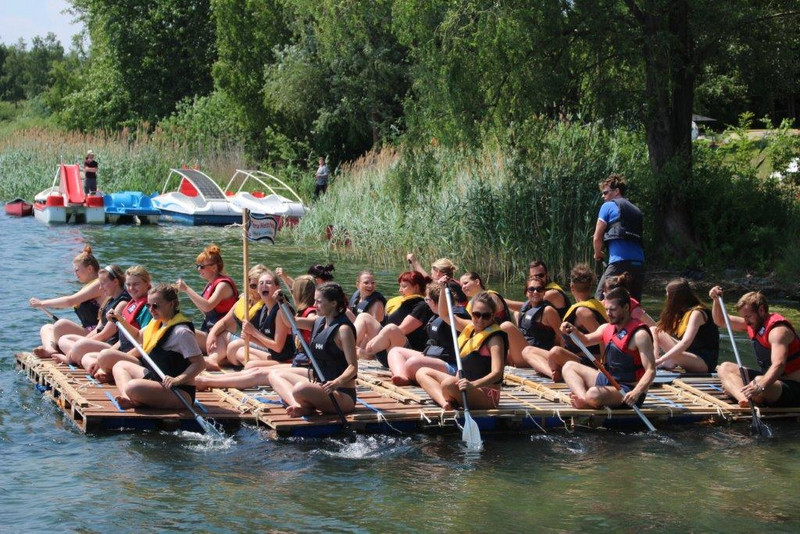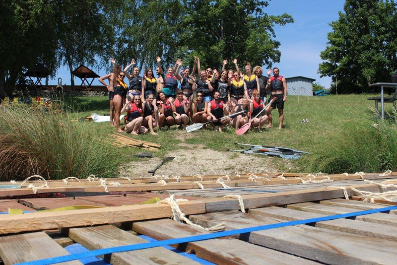 Am 07. Juni 2018 verbrachten wir, die Erzieherklasse E17/1 der Henriette-Goldschmidt-Schule, einen pädagogischen Tag bei „Ab ans Ufer“, einer Location am Kulkwitzer See, gegründet und geleitet von David Weide und Stephan Riedel. Um 9:30 Uhr trafen wir uns gemeinsam mit unserer Klassenlehrerin Frau Kreißig, begleitet von Frau Langbein und Herr Conrad. Um 9:40 Uhr bekamen wir unsere Mission von Stephan Riedel vorgestellt. Diese bestand darin, aus 20 Holzpaletten, 80 Kanistern, 30 Holzlatten, 450m Seil und mehreren Spanngurten ein Floß zu bauen, welches unsere ganze Klasse, inklusive unserer drei Lehrer, auf dem See zum verankerten Tretboot fährt. Außerdem bekamen wir noch den Tipp, dass Kommunikation das A und O bei unserem Vorgehen sein wird. Celeste machte den Anfang und nahm sich die erste Palette, dazu vier Kanister. Weitere Leute versammelten sich um diese Palette und gemeinsam wurde spekuliert und ausprobiert, wie wir das Floß am besten bauen könnten. Unsere Idee war ziemlich gut, trotzdem bekamen wir nach einer viertel Stunde noch einen kleinen Tipp von Stephan, wie wir die Kanister besser an den Holzpaletten befestigen können. Dann bildeten sich mehrere kleine Gruppen. Sie legten in jede Holzpalette vier Kanister und befestigten diese mit je zwei Spanngurten. Gegen 10:45 Uhr waren die 20 Einzelpaletten fertig und wurden nun im Wasser mit Holzlatten und mehreren kleinen Seilen zu einem Floß zusammengefügt. Eine Stunde später war es dann fertig, unser selbstgebautes Floß. Wir legten eine Pause ein, da wir verhältnismäßig sehr schnell fertig geworden sind. Kurz nach 12:00 Uhr wurden die Schwimmwesten angezogen und man stellte einen Plan auf, wie wir bei dem bemerkenswert schönen, sonnigen Wetter gegen den starken Wind ankommen könnten. So ergab es sich, dass rechts und links auf dem Floß insgesamt zehn Leute je ein Paddel hatten und damit das Floß vorwärtsbrachten. Hinten drauf stand Stephan, er gab die Anweisungen. Auf dem Tretboot entdeckten wir dann einen Schatz und dieser war voll mit Gummibären, die wir selbst verzehren durften. Wieder zurück an Land haben wir alle gemeinsam gegrillt, gegessen und Volleyball gespielt und zum Schluss gab es noch eine kleine Reflexionsrunde, gemeinsam mit Stephan. Unsere Klasse befindet sich im ersten Ausbildungsjahr und besteht erst seit August 2017. Der Sinn dieses Ausfluges bestand darin, dass wir als gesamte Klasse etwas zusammenrücken, uns gemeinsam Problemsituationen stellen und somit die Kommunikation untereinander fördern. Und zusätzlich war es eine tolle Erfahrung, zusammen mit den Lehrern auch mal außerhalb der Schule Spaß und Freude erleben zu dürfen.