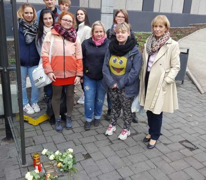 Anlässlich des 80. Jahrestag der Reichspogromnacht machten sich die Klassen E18-3 und die HEP18 im Rahmen des Wirtschafts- und Sozialkundeunterrichts mit Frau Dr. Luderer auf den Weg, um die Stolpersteine der Familie Frankenthal zu putzen. Über das erschütternde Schicksal der Familie Frankenthal erfuhren wir vorher im Unterricht: Dr. Ludwig Frankenthal (*1885), lebte mit seiner Frau Ilse Frankenthal (ehemalige Hinrichsen) und seinen zwei Söhnen Günther (*1929) und Wolfgang (*1931) am Dittrichring 13, schräg gegenüber der Thomaskirche. Ludwig Frankenthal wurde in der Reichspogromnacht am 10.November 1938 in das KZ Buchenwald verschleppt. Er wurde jedoch durch die vermehrten Interventionen seiner Frau wieder entlassen, unter der Bedingung innerhalb von zwei Wochen Deutschland zu verlassen. Am 14.November 1938 konnte die Familie Frankenthal in die Niederlande fliehen. Doch nach der deutschen Besetzung der Niederlande, wurde die gesamte Familie Frankenthal am 8. April 1943 in das KZ Westerbork eingewiesen, im September 1944 nach Theresienstadt und am 12. Oktober 1944 in das KZ Auschwitz deportiert. Ilse und ihr Sohn Günther wurden in das Lager eingewiesen, während Ludwig und sein Sohn Wolfgang direkt nach der Ankunft ermordet wurden. Die am 30. Juli 1987 verstorbene Ilse Frankenthal (in den Niederlande) überlebte den Holocaust, doch ihr Sohn Günther starb mit 15 Jahren, am 28. Februar 1945 an den Folgen der brutalen Zwangsarbeit. Anschließend machten sich die zwei Klassen auf den Weg um die drei Stolpersteine von Dr. Ludwig F. , Günther F. und Wolfgang F. , welche die Henriette-Goldschmidt-Schule gestiftet hatte, zu putzen und Blumen nieder zu legen. Als wir am Dittrichring 13 ankamen, waren die Steine schon geputzt und auch Blumen waren schon niedergelegt. Wir zündeten trotzdem eine Kerze an und stellten sie neben die Steine. Zu den schon niedergelegten Rosen legten wir noch drei Rosen dazu. Um die Gedenkaktion abzuschließen, sangen die Schüler aus der E18-3 noch ein hebräisches Lied „Donna Donna“ Das Lied handelt von einem Kälbchen, das sich nicht dagegen wehren kann, zur Schlachtbank geführt zu werden. Die Schwalbe hingegen bestimmt ihr Schicksal selbst, symbolisiert Eigenständigkeit und Selbstverantwortung, die Basis der Freiheit. Nach dem Lied gingen die Klassen zur Gedenkstätte der ehemaligen Synagoge in der Gottschedstraße. Das Denkmal zeigt den Grundriss der 1938 in Brand gesetzten Synagoge. Auf einem über eine Rampe erreichbaren Plateau stehen 140 bronzene Stühle und ringsum rankt grünes Gesträuch, eingerahmt von einer niedrigen Mauer. Als wir das Denkmal an diesem Tag sahen, waren wir alle sehr berühert, denn auf jedem einzelnen Stuhl lag eine Rose und neben das Denkmal wurden große Kränze und Blumengestecke unterschiedlichster Vereine und Personen gelegt. Diese Gedenkaktion zum 79. Jahrestag der Reichspogromnacht 1938 war eine sehr berührende Erfahrung für die Klassen E18-3 und die HEP18.