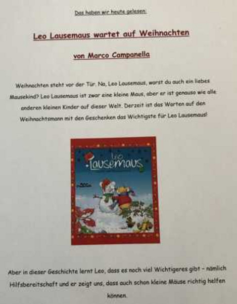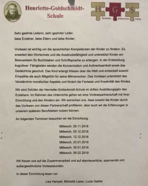 Im Rahmen des Wahlpflichtunterrichts „Sprache fordern- Sprache fördern“ wurden die Schüler der Klassenstufe E16 zu Vorlesepaten in unterschiedlichen Kindertageseinrichtungen der Stadt Leipzig. Der Umfang dieses Projektes beträgt insgesamt neun Leseeinheiten. Sie zeigen wie wichtig das Vorlesen für die kindliche Entwicklung ist und präsentieren kreativ und kindgerecht verschiedenste Bücher und deren aktuelle Thematiken. Am 05.12.2018 waren Lucie Gabler, Michelle Lazar und Lisa Hampel in der Brüderstraße und lasen „Leo Lausemaus“ vor.