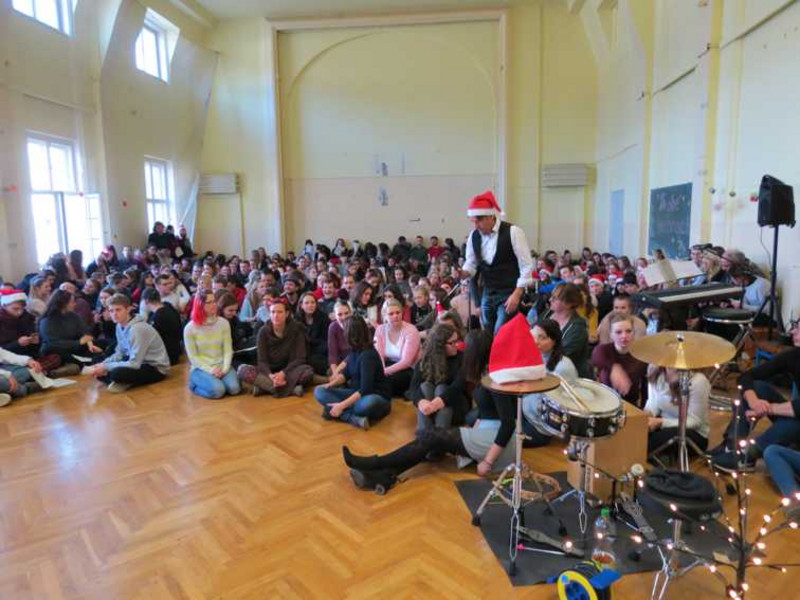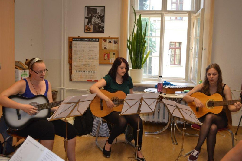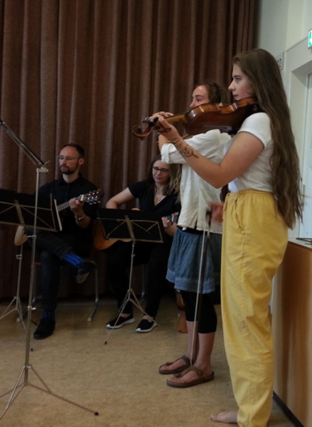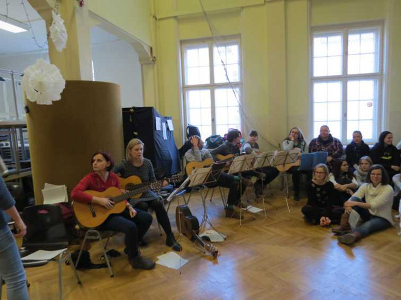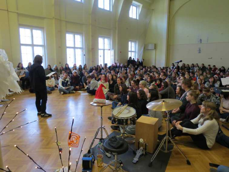 Begleitet wurde die Gedenkfeier von Gitarrenspiel und jiddischen Liedern aus dem Alltag und fröhlichen Zeiten, die von Schülern gesungen und gespielt wurden. Die Klänge der Stimmen und Gitarren hallten durch die Flure und Treppenhäuser der Schule. Man war als Zuschauer dazu angeregt mitzusingen. Zum Gedenken wurden kurze Originalsätze von Leipziger jüdischen Zeitzeugen vorgetragen und Kerzen angezündet, welche in der Mitte des Raumes positioniert wurden.