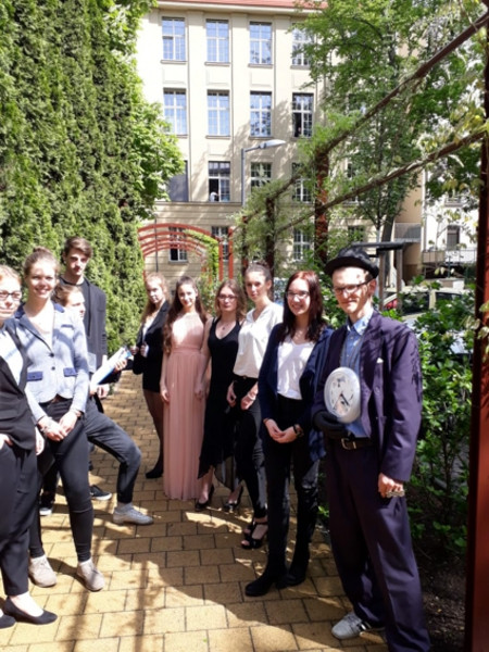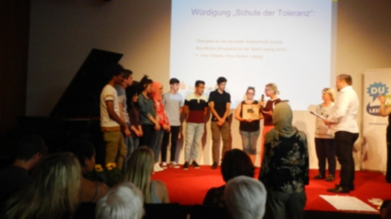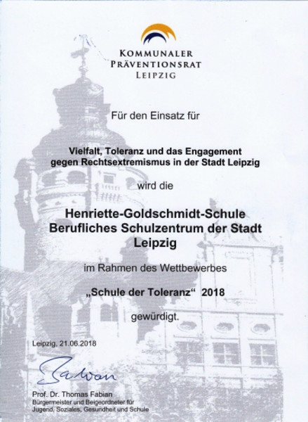 Schüler der VKA und angehende Erzieher aus der E 15 nahmen am Wettbewerb "Schule der Toleranz" 2018 teil. Das am 24.5.2018 einer Jury im Neuen Rathaus vorgestellte Projekt entstand im von Frau Duran und Frau Nitzschke geführten Wahlpflichtfach "DAZ". Dieses bot den Rahmen, um in gemeinsamen kleinen Projekten den Schülern der VKA die deutsche Sprache, die Stadt Leipzig und verschiedene Traditionen näher zu bringen. In die Endausscheidung kamen 12 Leipziger Schulen. Bei der Auszeichnungsveranstaltung am 21.6.2018 im Mediencampus "Villa Ida" erhielt unsere Schule viel Lob und eine gemeinsame Reise nach Dresden für alle Beteiligten.