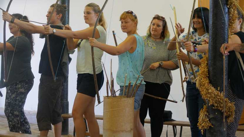 Am 22.08.18 um 7.30 Uhr stehen wir, die Klasse E16-1, in der Spittastraße vor der Henriette-Goldschmidt-Kita und erwarten freudig die Vorschulgruppe, mit der wir gemeinsam in den Naturpark Canitz, in der Nähe von Wurzen, fahren. Die Sonne erwärmt die Luft, als sich die Vorschüler bereit machen, um zur Steinzeit-Olympiade anzutreten. Sie messen sich im Bogenschießen und dem Erkunden von Steinzeitwerkzeugen und übertragen ihre Begeisterung kurze Zeit später auch auf uns. Besonders das Bogenschießen fesselte uns ausdauernd. Während die Kinder den Park intensiv auskundschaften und entdecken, werden wir herumgeführt und lernen die pädagogischen Möglichkeiten des Naturparks kennen. Besonders anregend erscheinen uns neben den Nachbauten germanischer und slawischer Lehmhütten, die verschiedenen, sehr liebevoll angelegten Themengärten. Von diesen ließen wir uns zum Verweilen und Entspannen einladen. Nach einem sonnigen, erlebnisreichen Vormittag stärkten wir uns gemeinsam mit den Kindern mit einer Bratwurst vom Grill. Für die Kinder gab es noch eine Siegerehrung, bei der sie, von den Mitarbeitern des Parks selbst hergestellte "Baumscheibenmedaillen" überreicht bekamen. Stolz und mit vielen neuen Eindrücken ging es für alle mit dem Bus zurück nach Leipzig. An diesen Ort werden wir uns gern erinnern, wenn wir einmal auf der Suche nach erlebnispädagogischen Ausflugszielen als ErzieherIn sein werden.