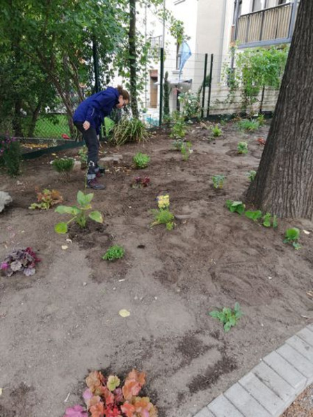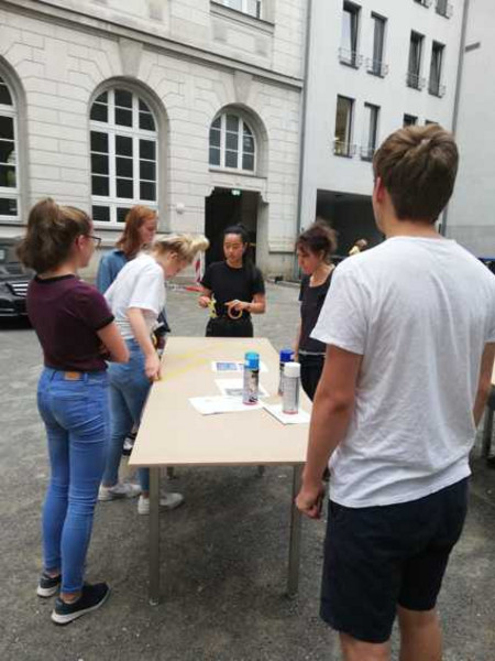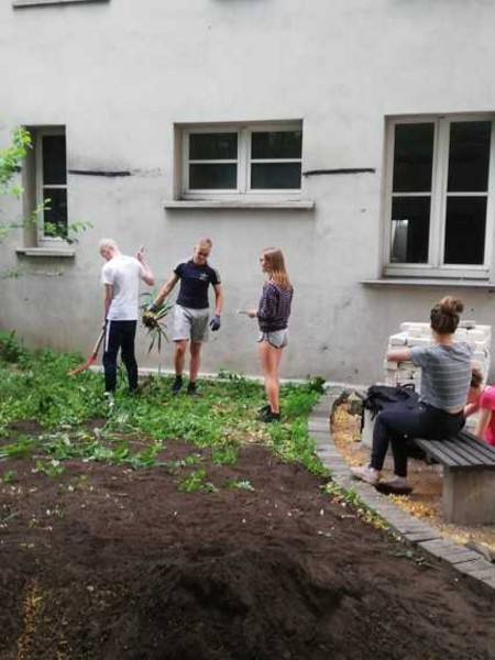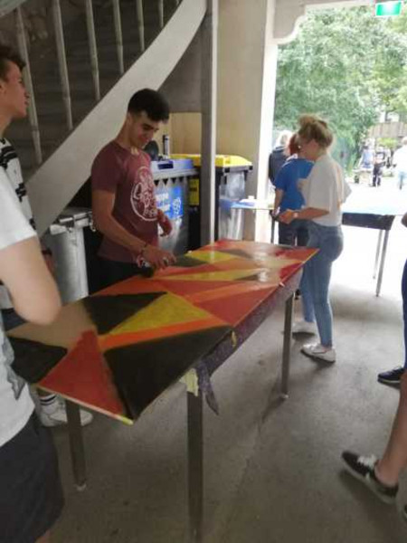 Am 1.7.2019 machten sich Schüler des BSZ 12 und die Klassen 11-1 und 11-2 unserer Fachoberschule im Rahmen des Projekts "Grün macht Schule" an die Verschönerung des Innenhofes der Außenstelle in der Kohlgartenstraße. Es wurden Blumenbeete neu angelegt, Steine verlegt, Maß für Rankhilfen genommen und Muster auf Holzplatten gesprayt, die später zur Verschönerung der Hochbeete dienen sollen. Ein eifriges Küchenteam sorgte für die Verpflegung. Es ging einkaufen, schmierte Schnittchen und schnippelte Obst und Gemüse. Das Eis am Ende hatten sich alle verdient. Viel Arbeit, die natürlich nicht an einem Tag zu schaffen war. Deshalb wird es im September eine Fortsetzung geben. Danke an alle Helfer.