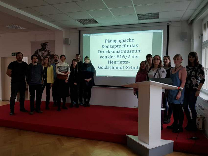 Im durch unsere Schulleiterin Frau Dr. Helfricht angebahnten Kooperationsprojekt des Druckkunstmuseums Leipzig und der Henriette-Goldschmidt-Schule entwickelte unsere Klasse E16/2 im Zeitraum vom 09.11.2018 bis zum 01.02.2019 das museumspädagogische Konzept der altehrwürdigen Einrichtung weiter. Nach einem ersten Treffen und einer ausgedehnten Führung und Fragerunde, geleitet durch die Direktorin des Hauses, Frau Dr. Richter, konnten sich unsere SchülerInnen einen Überblick über bestehende museumspädagogische Strukturen, die verfügbaren Räume und die Ausstattung des Druckkunstmuseums verschaffen. Eine Evaluationsgruppe arbeitete danach weiterhin vor Ort und begleitete die Führung von Schülergruppen. Im Anschluss daran wurden im Lernfeld 3-Unterricht Herrn Conrad's gesammelte Erfahrungen ausgewertet, Ideen entwickelt und letztendlich ein in sich schlüssiges museumspädagogisches Konzept kreiert. Der in diesem Zusammenhang ausgearbeitete, kohärente Angebotskatalog zielt darauf ab, gerade jüngeren Besuchern, wie etwa Schulhortgruppen, eine auf ihre Entwicklung zugeschnittene mögliche Erfahrungswelt des Druckkunstmuseums zu eröffnen. Die im Konzept enthaltenen aufeinander aufbauenden Angebotsmodule laden zu mehreren aufeinanderfolgenden Besuchen des Druckkunstmuseums ein - und das bei Bedarf auch über verschiedene Altersphasen hinweg. Einige Angebotselemente setzen dabei darauf, vor dem Museumsbesuch - etwa in der Schule - Vorüberlegungen anzustellen, wie etwa ein Logo zu entwerfen oder sich später im Museum bildlich zu gestaltende Fabeln auszudenken. Am 01.02.2019 fand die Präsentation des weiterentwicklelten museumspädagogischen Konzeptes statt (siehe Fotos), die von Seiten des Druckkunstmuseums durch Frau Dr. Richter mit viel positivem Feedback gewürdigt wurde. Frau Dr. Richter stellte in der darauf folgenden Gesprächsrunde die Umsetzung gewisser Teile des Konzeptes in greifbare Aussicht, lud die SchülerInnen der E 16/2 sehr wertschätzend ein, sich auch gern schon im Rahmen ihrer anstehenden Prüfungspraktika an der Umsetzung eines selbstentwickelten Moduls zu erproben und betonte ihren Wunsch zur Fortsetzung der Kooperation mit unserer Schule aufgrund der sehr gelungenen Zusammenarbeit. Bis jetzt kann das Projekt in allen Phasen als erfolgreich beschrieben werden. Nun sind wir als Schule gespannt, inwiefern das weiterentwickelte Konzept der E 16/2 in seiner Umsetzung Anklang finden wird. Wir wünschen allen jüngeren und älteren Besuchern des Druckkunstmuseums Leipzig einen erfahrungsreichen und kreativen Aufenthalt und freuen uns auf die weitere Zusammenarbeit mit diesem so facettenreichen und schönen Museum. www.druckkunst-museum.de/de/ www.facebook.com/museumfuerdruckkunst