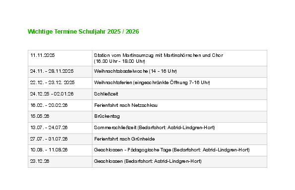 Wichtige Termine des Horts für das Schuljahr 2025/26