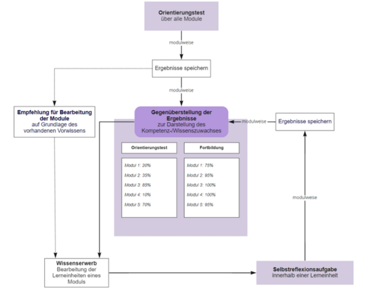 Vor Beginn der Fortbildung soll ein Orientierungstest abgeschlossen werden, um bereits vorhandenes Vorwissen der Teilnehmenden abzufragen. Auf Grundlage der Ergebnisse wird den Teilnehmenden eine Empfehlung ausgegeben, welche Module (priorisiert) bearbeitet werden sollen. Die Teilnehmenden können einen Überblick über ihren eigenen Wissens-/Kompetenzzuwachs erhalten, indem die Ergebnisse des Orientierungstest mit den Ergebnissen der Selbstreflexionsaufgaben aus den einzelnen Lerneinheiten – dargestellt pro Modul, gegenübergestellt werden.