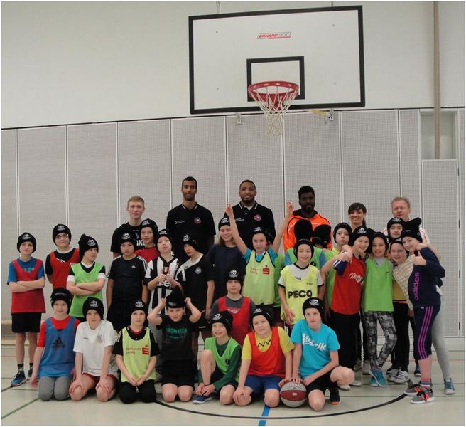 Am 29. 02. 2016 war ein ganz besonderer Tag für einige Viertklässler der Franz-Mehring-Schule Leipzig. Der MBC gastierte zum dritten Mal in Folge in deren Sporthalle und trumpfte mit 3 MBC-Profis auf. Mit am Start waren der MBC-Kapitän Frantz Massenat, Power Forward TaShawn Thomas und Nachwuchsspieler Adam Touray. Angeführt vom Nachwuchstrainer Mario Leuschner betraten die 2 m- Hühnen den Hallenboden der Franz-Mehring-Turnhalle. Nach allgemeinen Aufwärm- und Stretchübungen durften die Kids sich im Dribbeln & Ballhandling bei Frantz austoben. Des Weiteren erhielten sie bei TaShawn Einblick in die Trickkiste bei Penetration & Shoot (Korbwurf) und letztendlich zeigte Adam ihnen Tricks und Kniffe beim Pass & Catch (Passen und Fangen). Gekrönt wurde das Training mit einem Blitzturnier, bei dem die Kids zusammen mit den Stars im Team spielen konnten. Zum abschließenden Höhepunkt erhielten die fleißigen Basketballer noch Autogramme von den Profis und coole MIBRAG-Wollmützen.