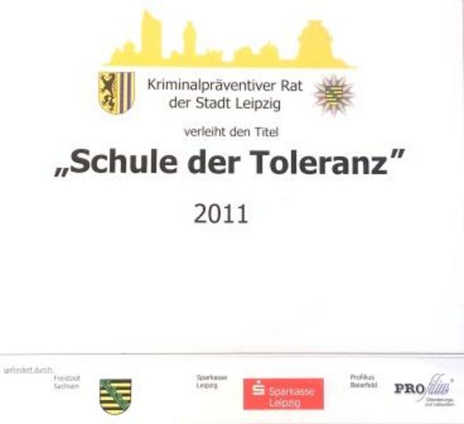 Bereits zum sechsten Mal wurde am 18.Juni 2011 in der Kuppelhalle der Leipziger Volkszeitung der Titel "Schule der Toleranz" vergeben. Der Titel ist mit einem Preis in Höhe von je 500 Euro verbunden, gesponsert durch die Sparkasse Leipzig. Er wurde an sechs Schulen verliehen. Vier weitere Schulen erhielten Anerkennungspreise. Ein Sonderpreis ging an das Projekt „Schule mit Zukunft Leipzig Ost“.