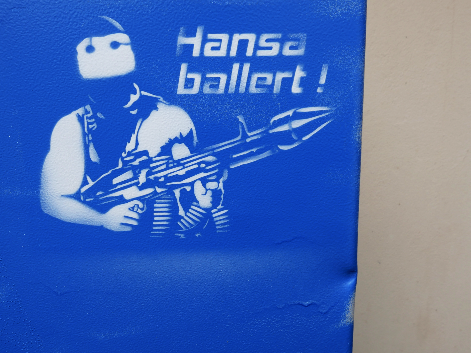 Da sind als erstes einige Schablonen-Graffiti auf den „KVS” - also den Kabelverteilerkästen. Meist haben die Stencil den Fußballclub Hansa Rostock zum Thema. Aber es gibt auch ein politisches Schablonen-Graffiti zu Putin. Im Großen und Ganzen ist aber die historische Innenstadt aber frei von Graffiti. An einer Wand entdeckte ich dann einige Paste-Up-Graffiti. Allerdings waren die schon in einem schlechten Zustand. Die richtige Graffiti-Szene wird natürlich in den Wohngebieten außerhalb des Stadtzentrums zu finden sein. Auch da wird Hansa Rostock eine große Rolle spielen, wie man an den vielen Graffiti an den Brücken auf den Weg nach Stralsund sehen kann.