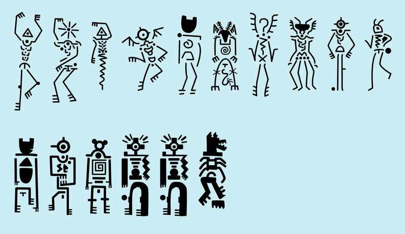 Ich habe mir die Fotos von den Strichmännchen hergenommen und sie in einem Vektorgrafik-Programm nachgezeichnet und dann in einem Font-Editor in eine Schrift verwandelt. Man kann mit dieser Schrift sozusagen die Strichmännchen „schreiben”. Ganz fertig ist der Font noch nicht. Aber es ist ja auch noch Winter und eben noch ein bisschen „Saure-Gurken-Zeit” :)).