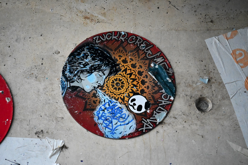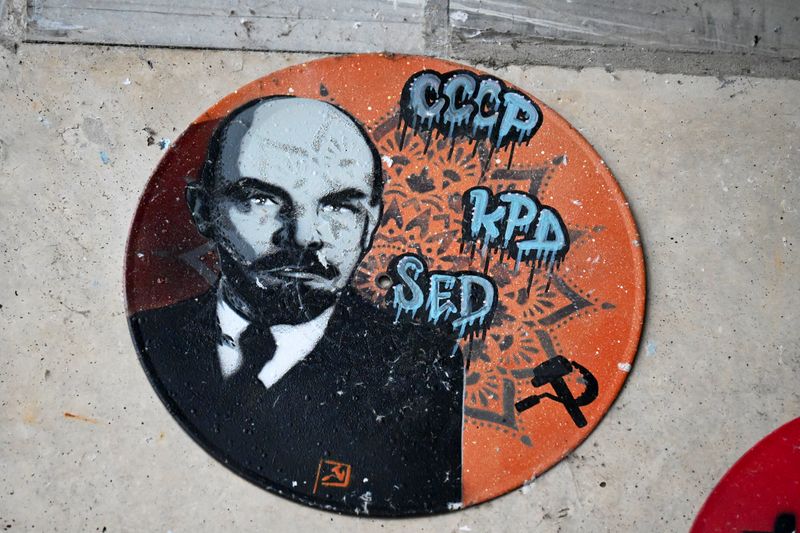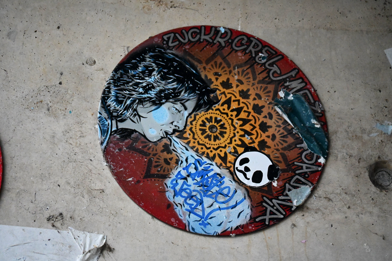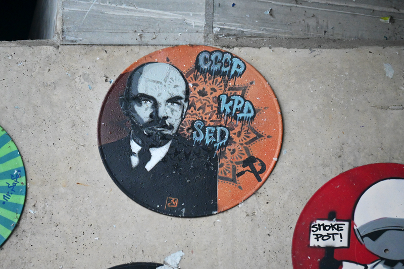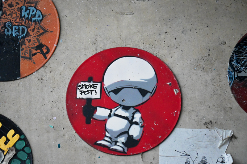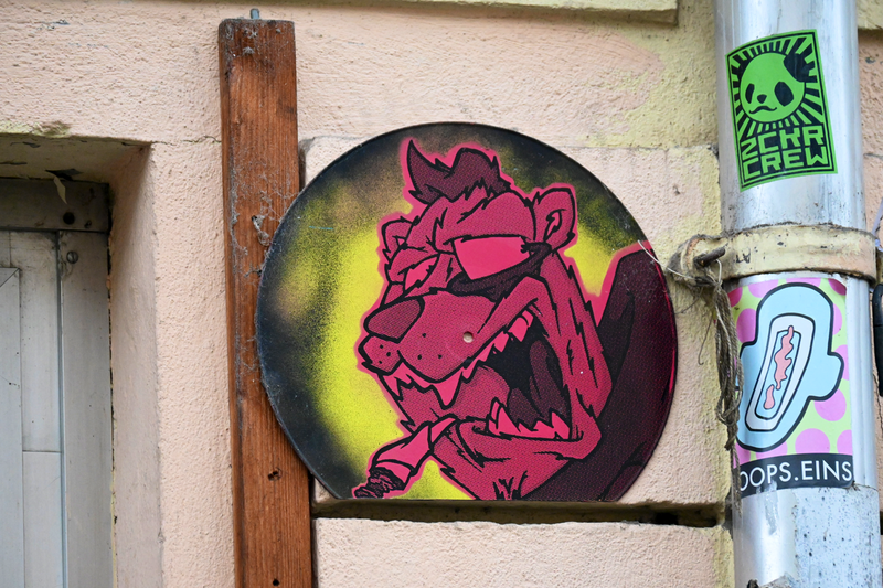 Erst dachte ich ja, dass die Streetartkunstwerke auf den alten Vinyl-Schallplatten eine Art Eintagsfliege sind. Aber nun wurde ich eines Besseren belehrt. An der Eisenbahnbrücke nach dem Bischofsplatz (im Hechtviertel) hängt sozusagen eine ganze Galerie von bemalten und gestalteten alten Vinyl-Schallplatten mit den verschiedensten Themen. Da ist von Lenin bis dem Roboter Marvin alles vertreten.