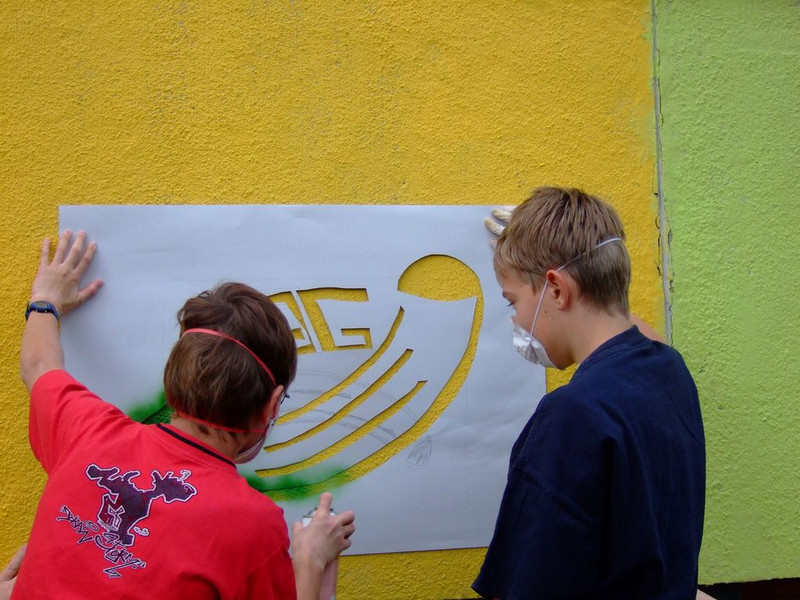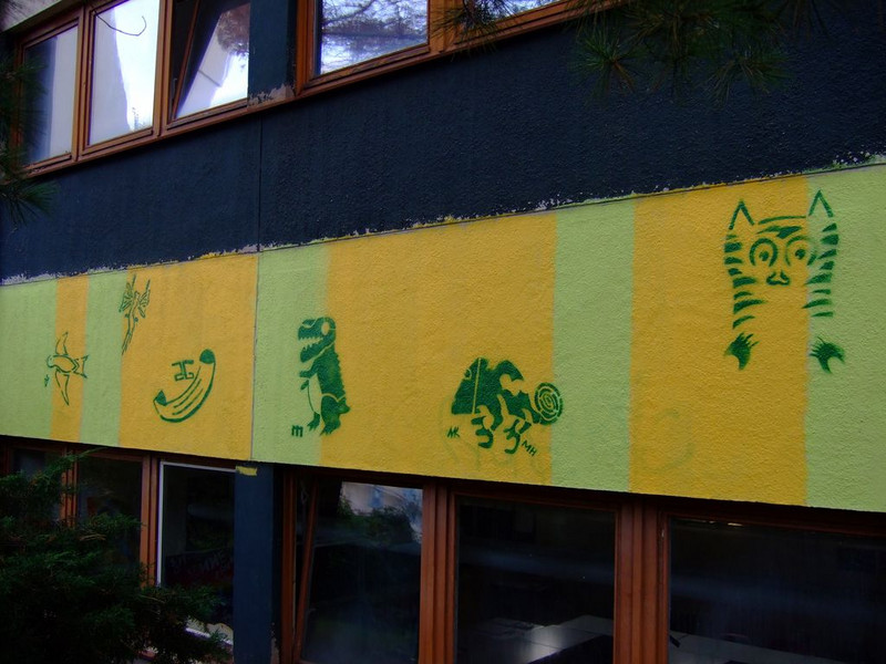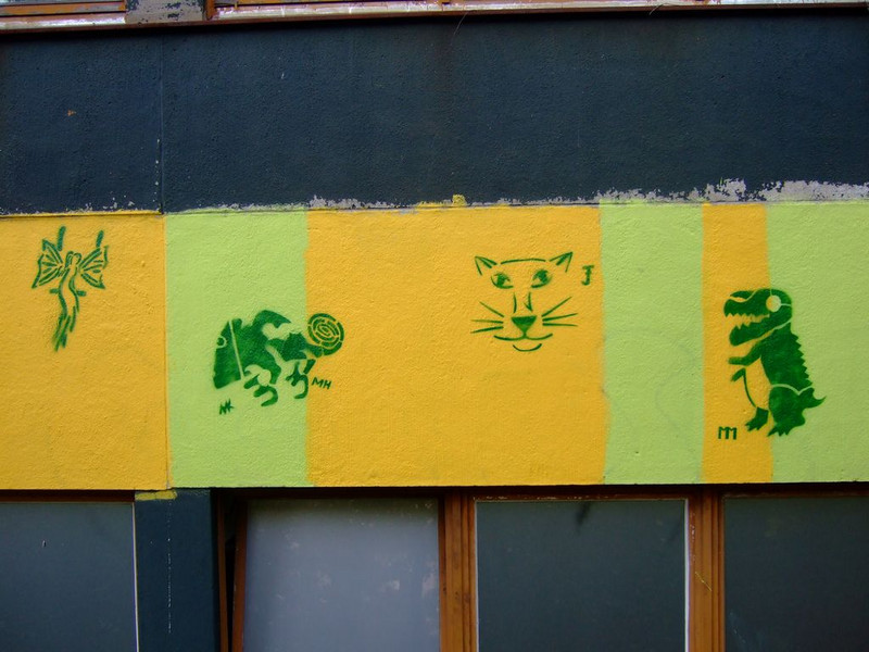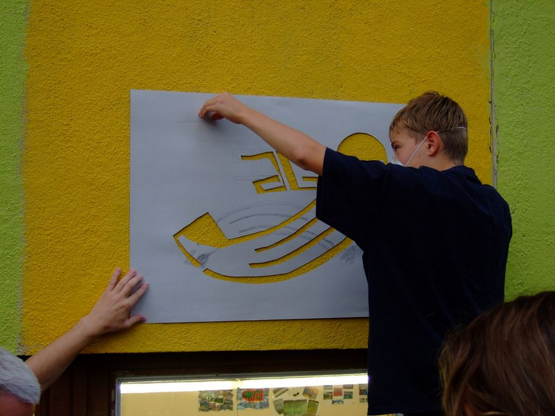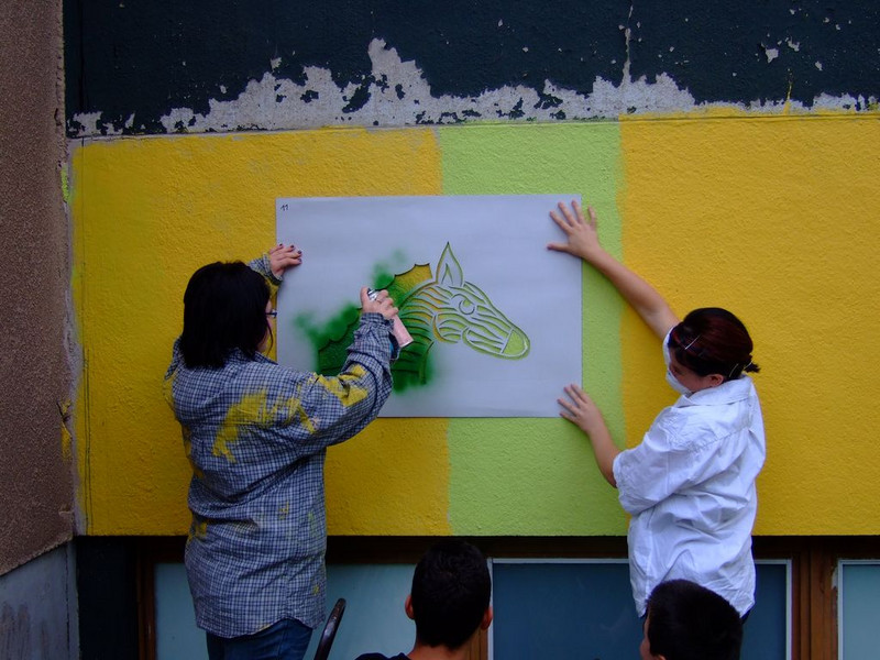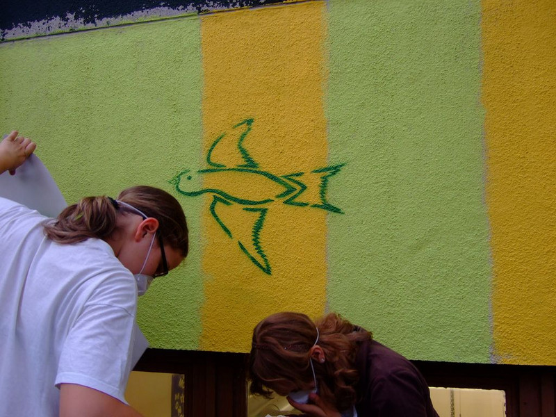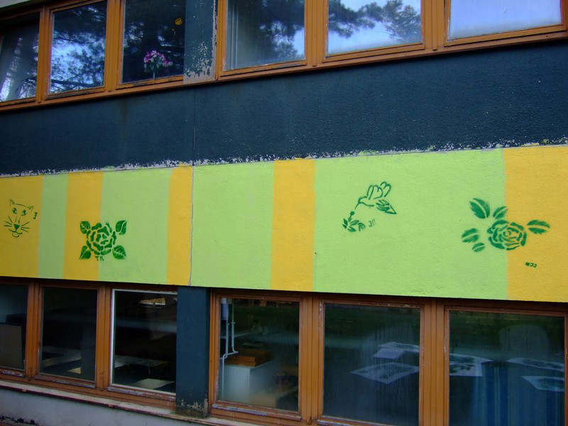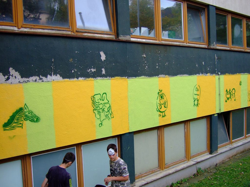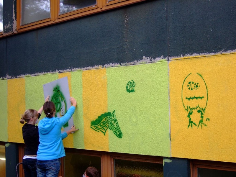 POCHOIRs – das Schulprojekt Teil 2. Wir hatten eine nicht so schöne alte Schule und eine Idee. Die Fassade der Schule sollte mit Schablonengraffiti neu gestaltet werden. Dazu waren natürlich mehrere Dinge zu erledigen. Wir brauchten die Genehmigung der Schulbehörde. Welch ein Wunder - haben wir bekommen!!! Die Fassade musste neu grundiert werden. Es mussten Entwürfe und daraus Schablonen entstehen. Und wir müssten die Pochoirs erfolgreich an die Wand bekommen. All diese Arbeiten sind in dieser Fotostrecke dokumentiert. Leider wurde die Schule inzwischen saniert und alle tollen Kunstwerke sind schon wieder Geschichte (deshalb auch die Genehmigung :)) ). Aber auf dieser Webseite leben sie noch ein bisschen weiter.