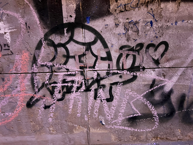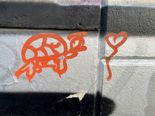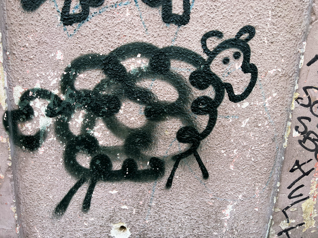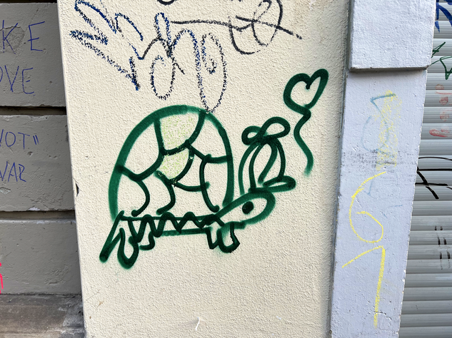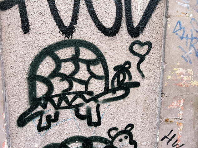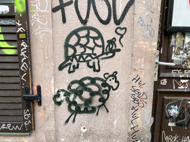 Die Schildkröte krabbelt weiter durch die Neustadt. Und immer noch ist die Schildkröte nicht schön. In der Regel hat die Schildkröte immer die selbe Größe. Aber jetzt ist auch eine kleine Schildkröte aufgetaucht. Und unter einer Schildkröte ist jetzt auch noch ein Schäfchen aufgetaucht. Ist das Schaf vom selben Sprayer, oder von einem anderen Künstler?
