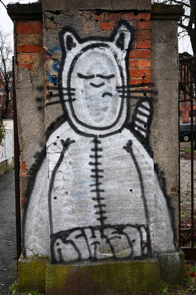 Die Neustadt-Katze bekommt Konkurrenz. Die von hinten aus gesehene, gesprühte Katze mit den markanten, aufgestellten Ohren und dem Schwanz taucht an vielen verschiedenen Stellen der Dresden Neustadt auf. Nun gibt es eine neue Katze in Serie. Sie zeigt uns ihr Gesicht mit sehr charakteristischen Barthaaren. Sie zieht eine Schnute und hat eine Jacke mit (wahrscheinlich) einem Reißverschluss an. Aber Vorsicht - diese Katze ist ein Streuner, denn sie taucht nicht nur in der Neustadt auf. Die Katze wurde auch im großen Umfang im Hechtviertel gesichtet. Sie traut sich bis an den Dresdner Heller und auch in Dresden Pieschen ist die Katze schon gesehen worden. Diese Katze kommt auch mal mit Graffiti-Text daher. Die neuen Katzen in der Neustadt auf dem Bischofsweg haben Zahlen. Ist das der Geburtstag oder die Nummer der Katze? Dann würden in der Neustadt noch eine ganze Menge mehr Katzenbilder versteckt sein. Die Katze ist oft auf einzelne Pfeilern gesprüht, ein bisschen wie bei den alten Ägyptern.