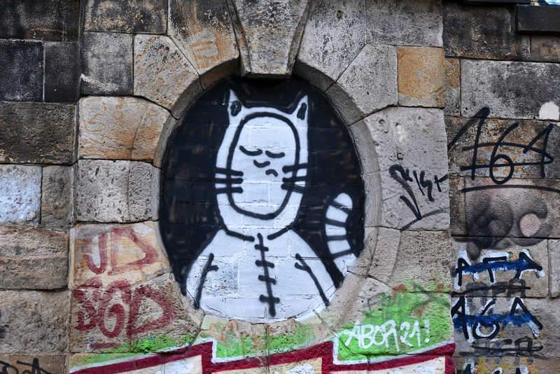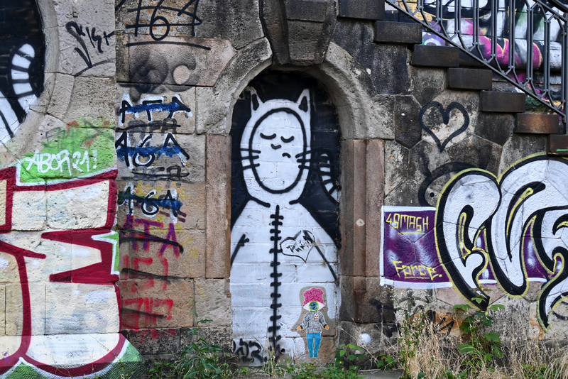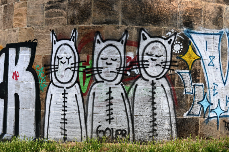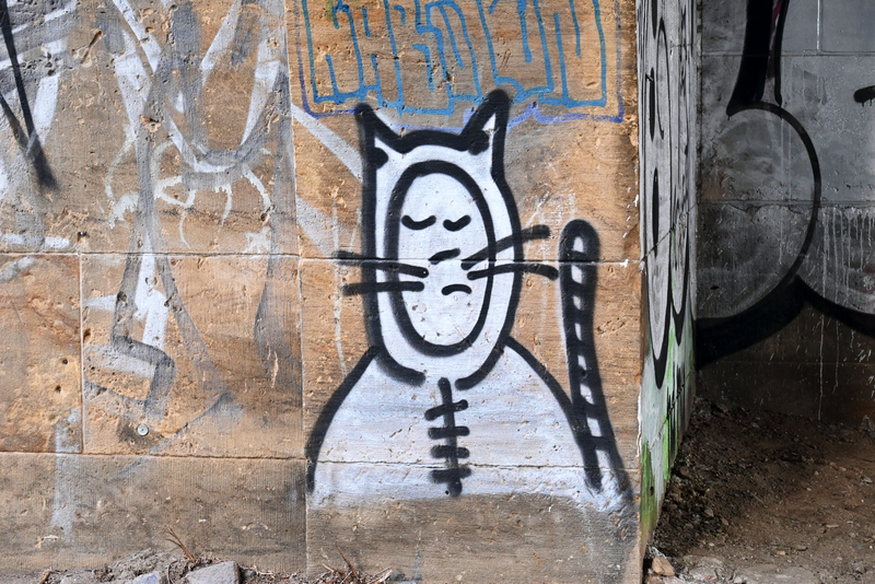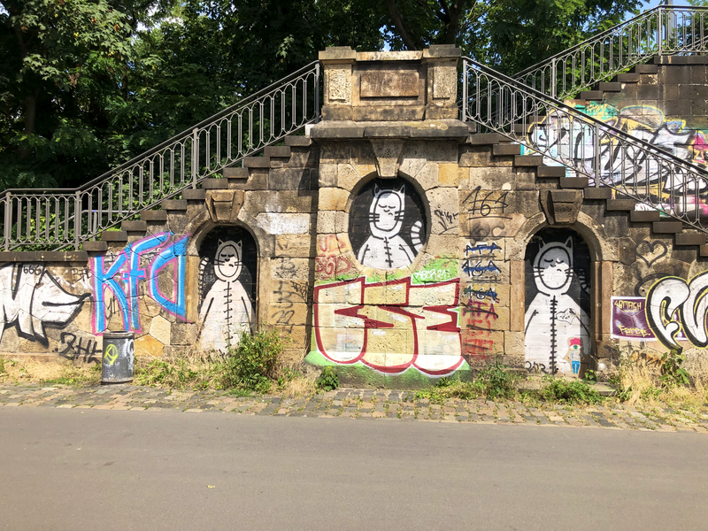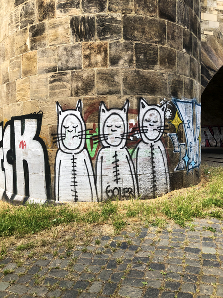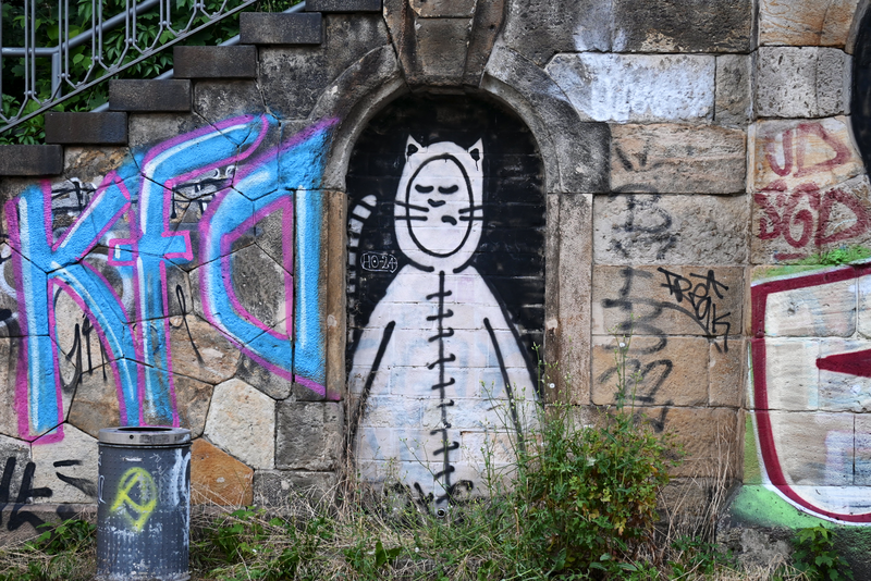 Katzen, so sagt man ja, sind eigentlich wasserscheu. Aber die ACHSO-Katze ist da wahrscheinlich eine Ausnahme. Nach dem die Suche nach neuen ACHSO-Katzen letztens etwas ins Stocken geraten war, sind nun neue Exemplare an der Marienbrücke aufgetaucht. Schon wen man an der Neustädter Elbseite an der Marienbrücken zur Elbe runtersteigt, zeigt sich an der Ecke zum Elbradweg die erste ACHSO-Katze. Geht man den Elbradweg weiter, sieht man eine weitere Solo-Katze am Brückenpfeiler der Eisenbahnbrücke. An den Treppen zur Elbe vom Garten des Japanischen Palais kann man wieder eine herliche Katzen-Galerie mit drei ACHSO-Katzen im Treppenrahmen bestaunen. Den Abschluss bildet das 3-er ACHSO-Katzenteam am Pfeiler der Straßen- und Fußgängerbrücke. Das 3-er Team ist signiert mit „GOLER” und nicht wie so oft üblich mit dem Wort ACHSO oder der Jahreszahl (z.B. 2022 oder 2023). Ist „GOLER” der Sprayer oder die Sprayerin der ACHSO-Katzen??? Ich weiß es nicht. Aber ich werde der ACHSO-Katze weiter auf der Spur bleiben.